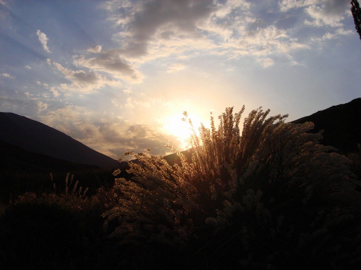 Description: A field with a sun setting behind a hill and trees in the foreground and a blue sky with clouds.