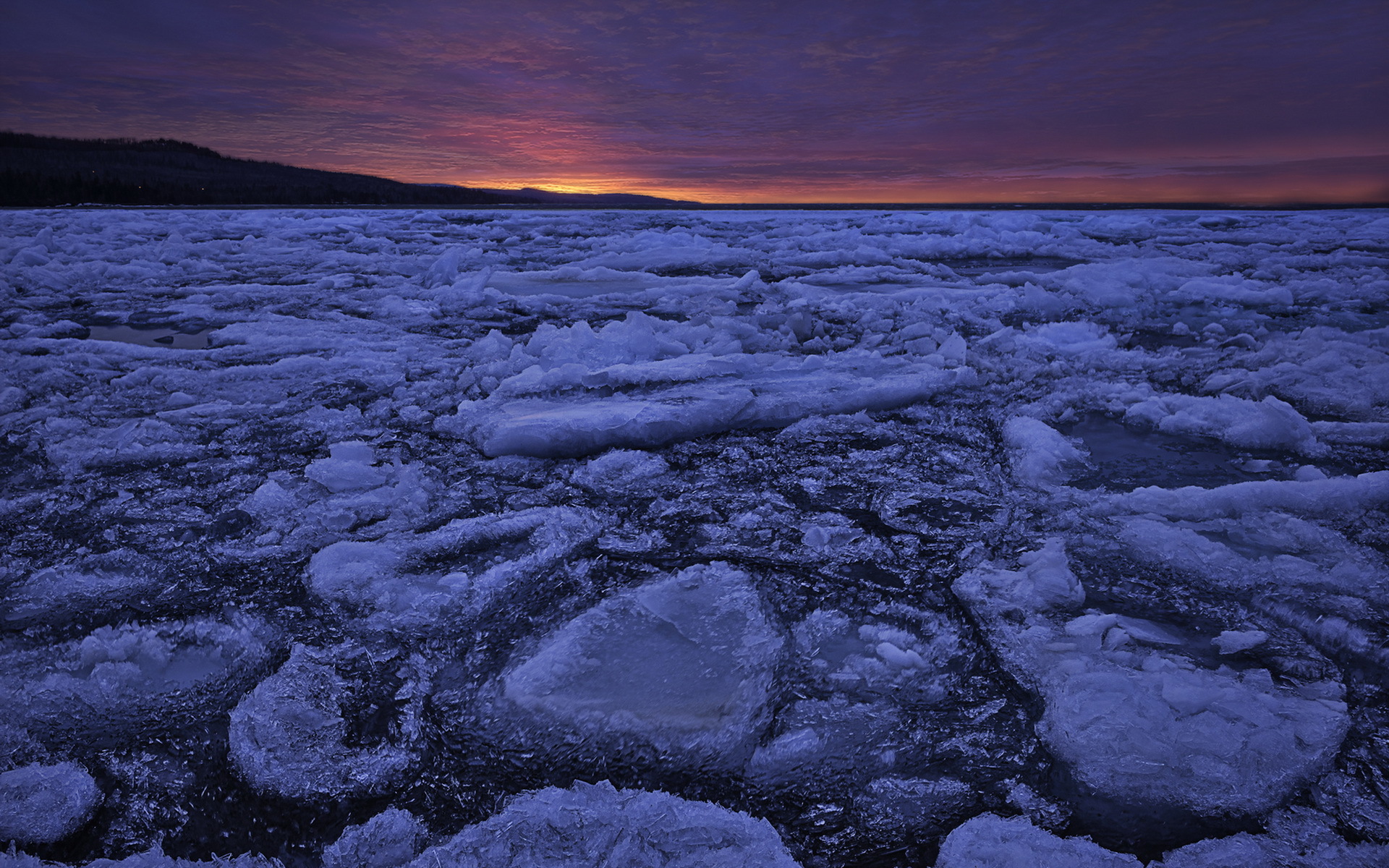 Description: A sunset over a large body of water with ice on it and a mountain in the distance with a sky filled with clouds.