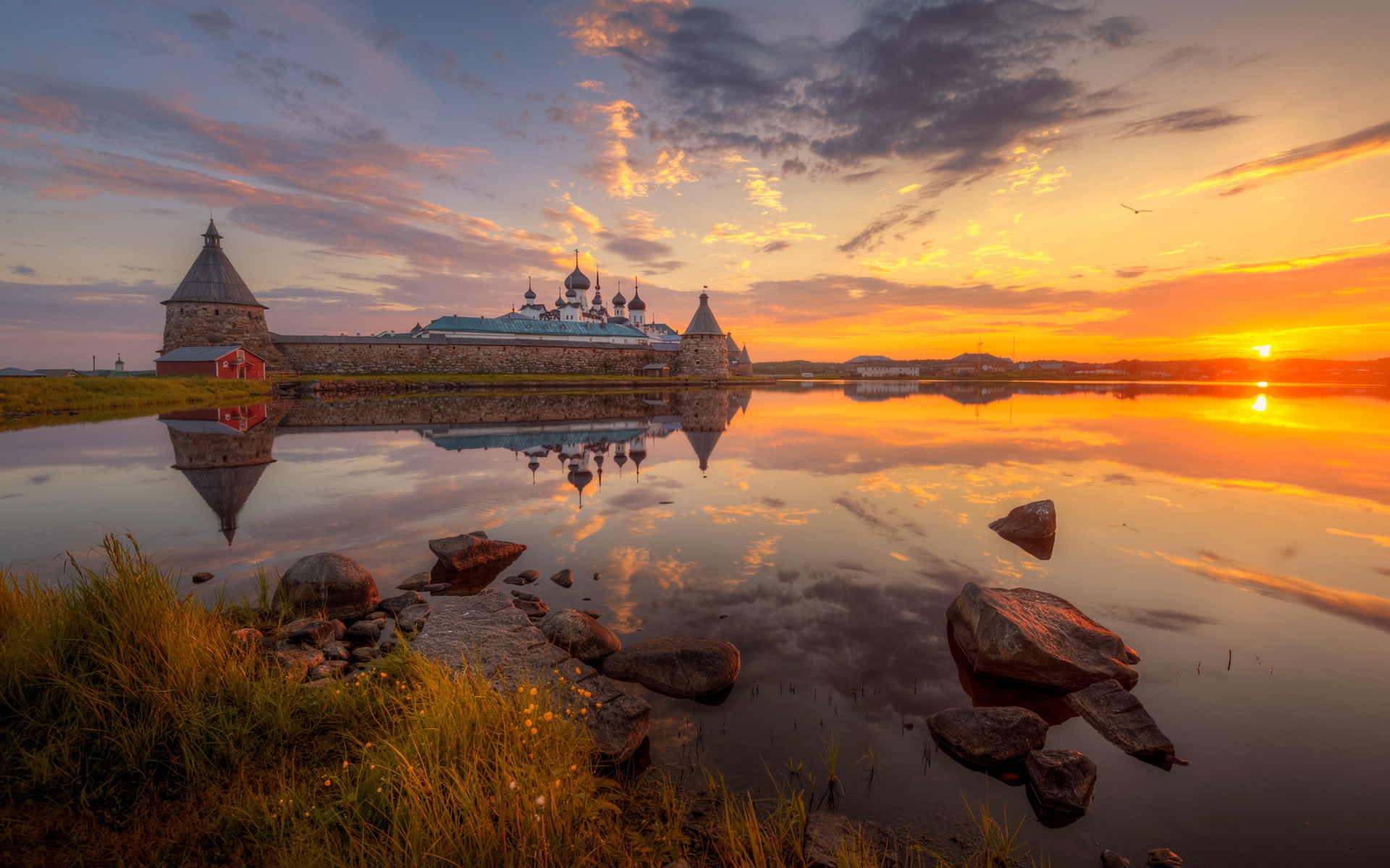 Description: A sunset over a lake with a castle in the background and a few rocks in the foreground and a few grass and rocks in the foreground.