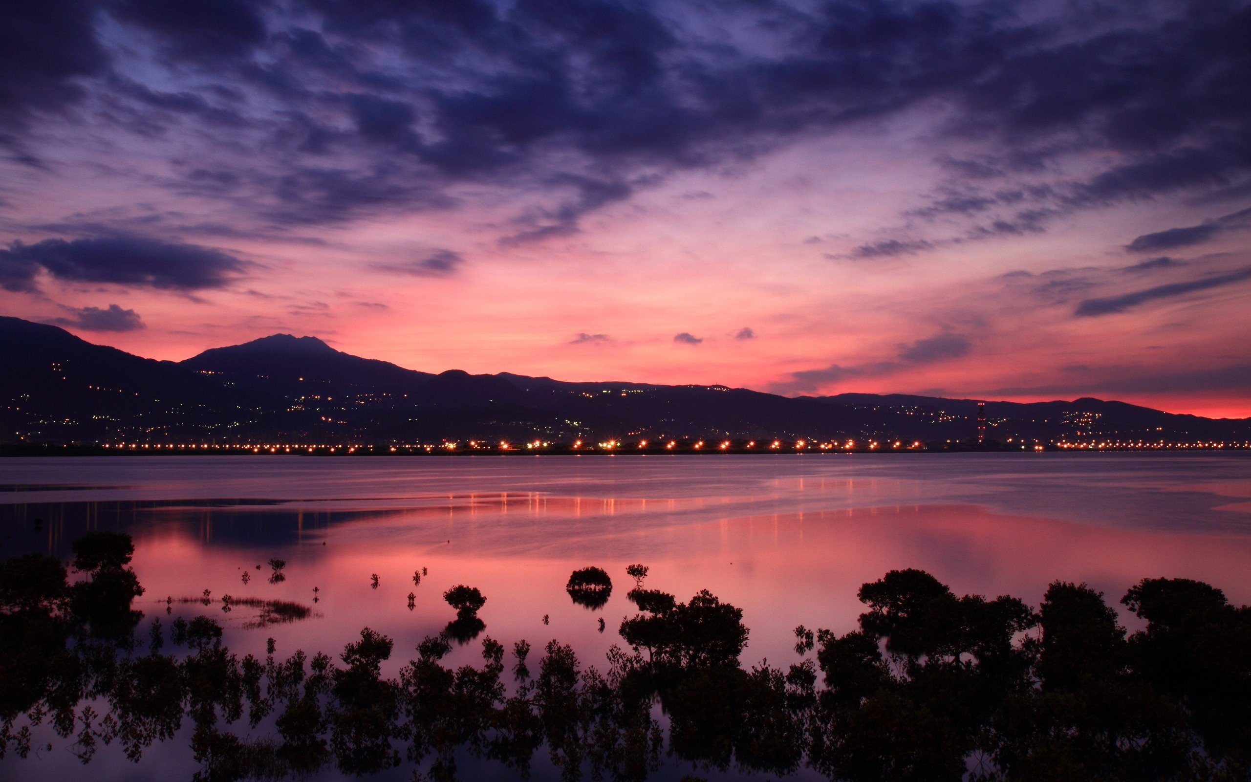 Description: A beautiful sunset over a lake with mountains in the background and a city in the distance with lights on.