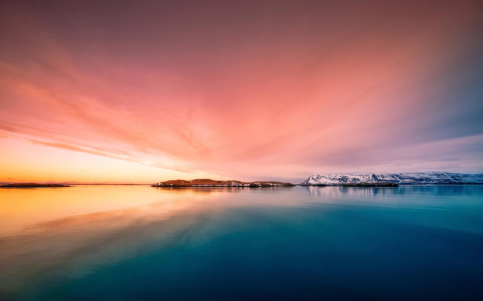 Description: A beautiful sunset over a lake with mountains in the background and a sky filled with clouds above it and a few houses on the shore.