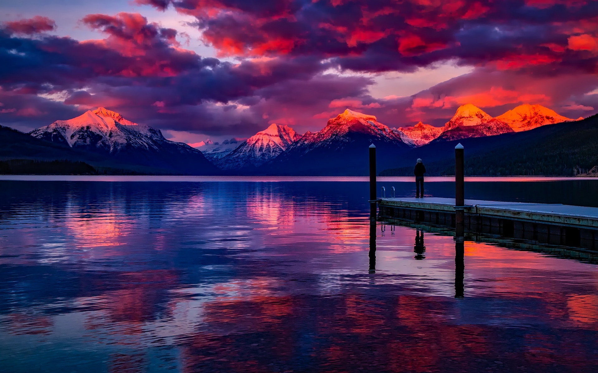 Description: A beautiful sunset over a lake with mountains in the background and a dock in the foreground with a dock in the foreground.