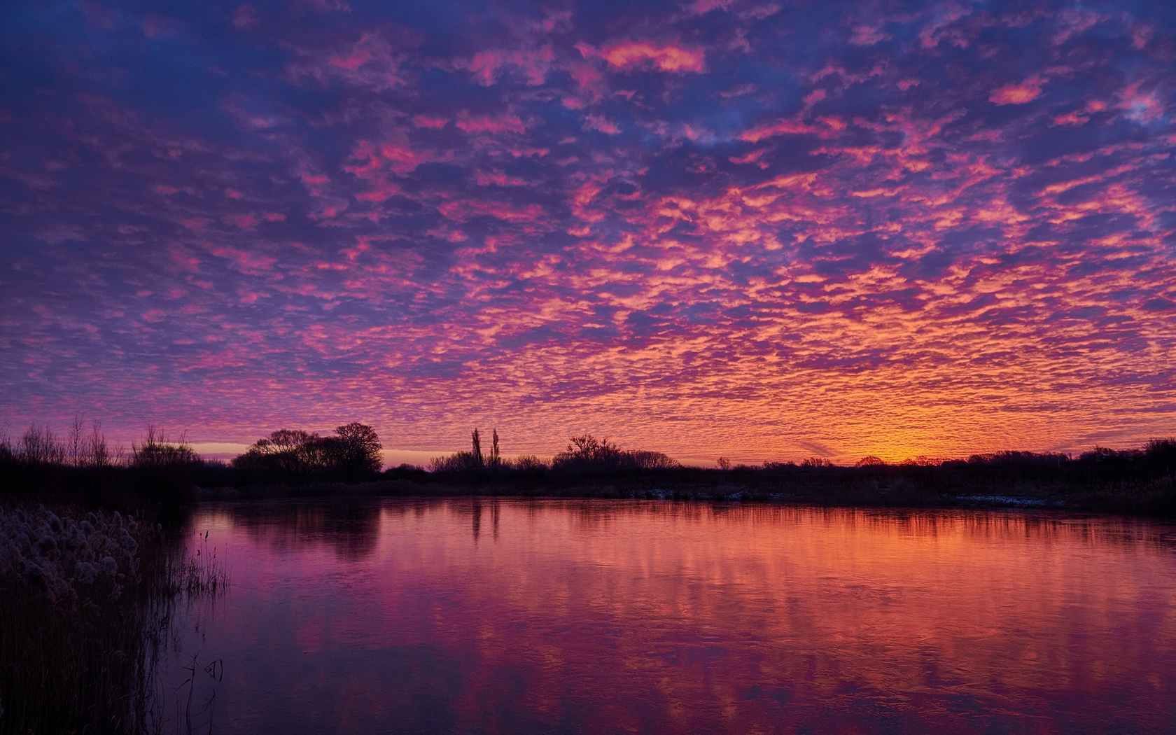 Description: A sunset over a lake with a purple sky and clouds above it and a few trees in the distance.