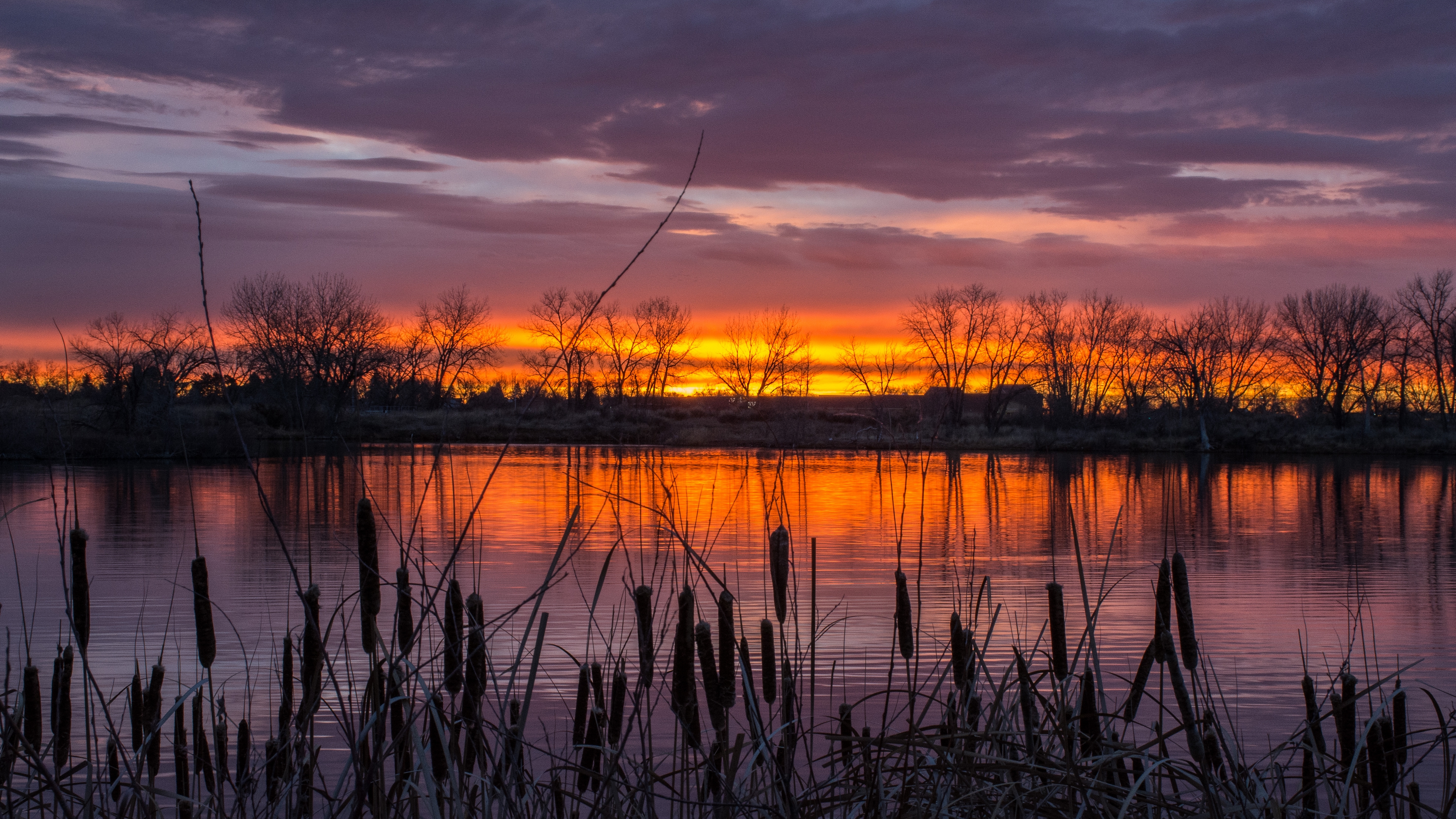 Description: A sunset over a lake with reeds in the foreground and a few trees in the background with a few clouds.
