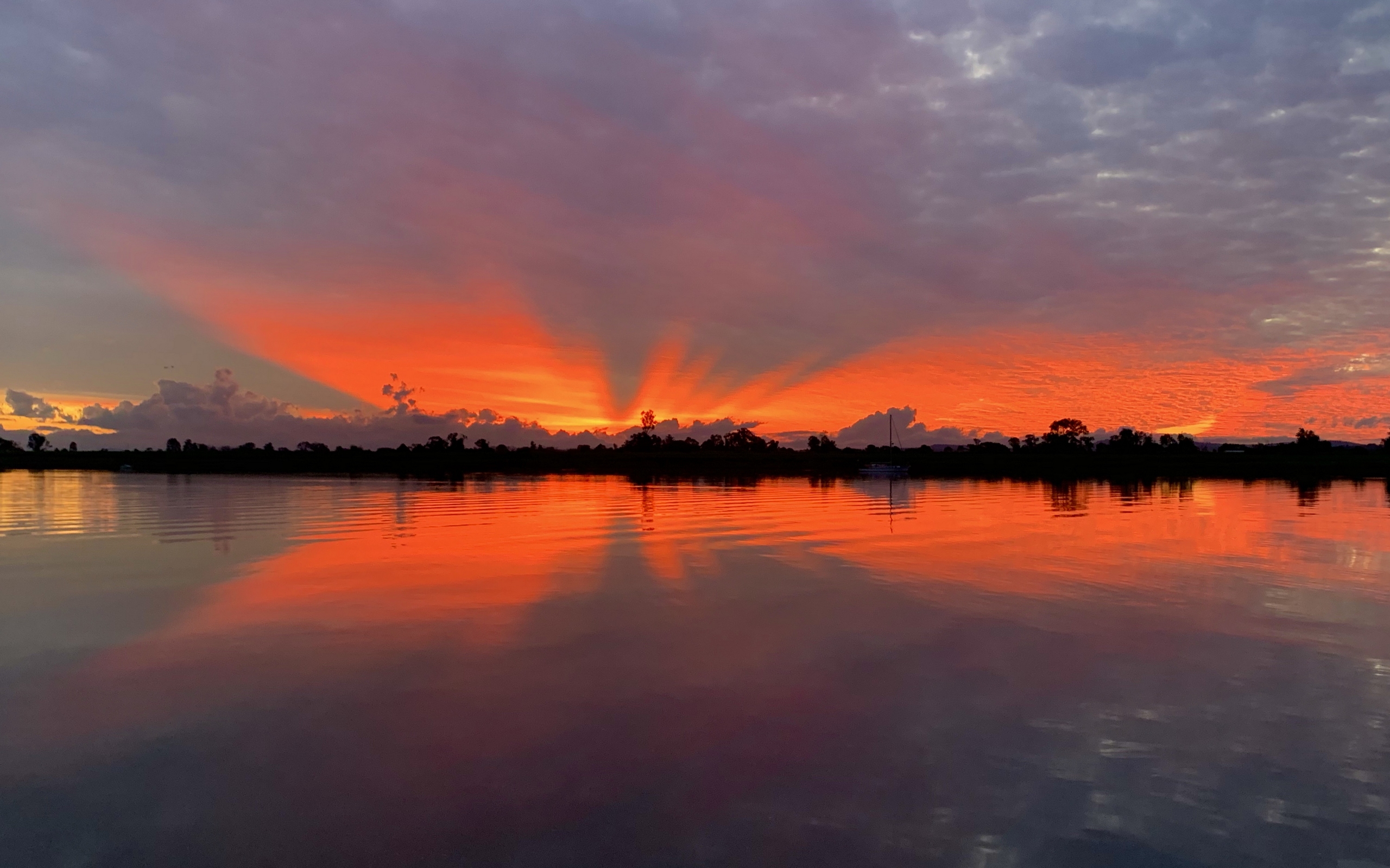 Description: A sunset over a lake with clouds reflecting in the water and trees in the distance with a few clouds.