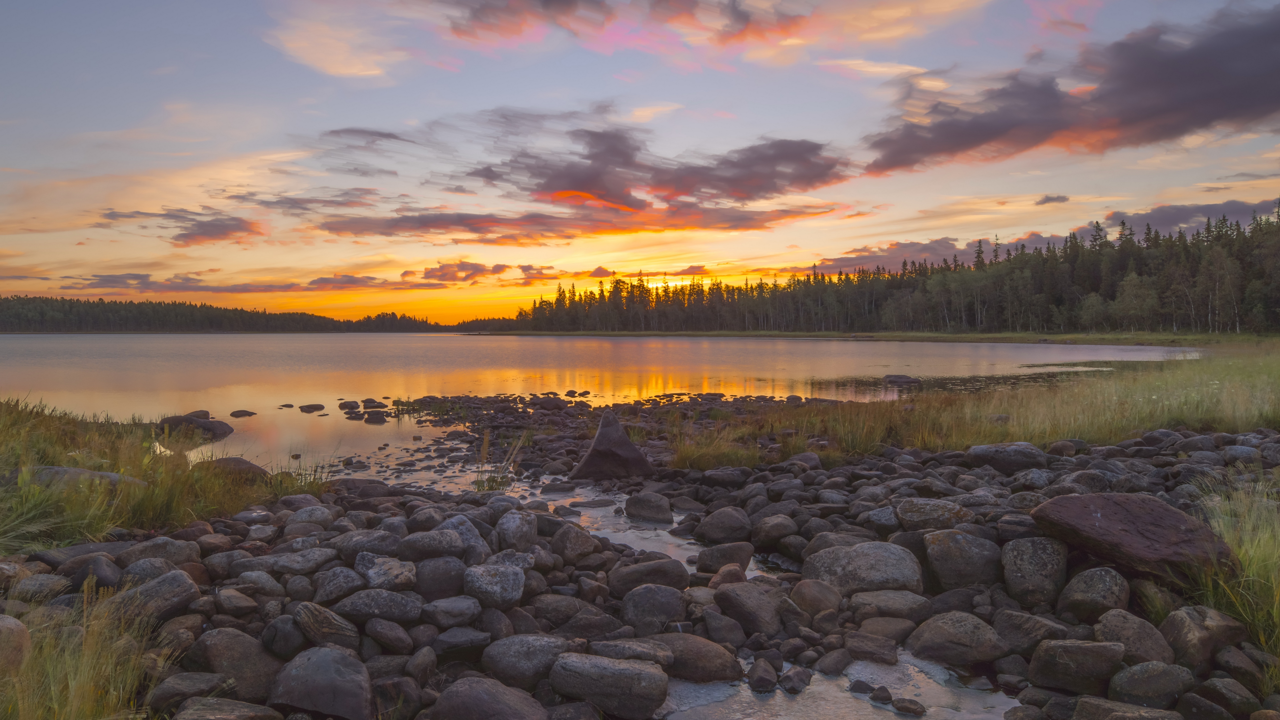 Description: A sunset over a lake with rocks and grass in the foreground and a forest in the background with a few clouds.