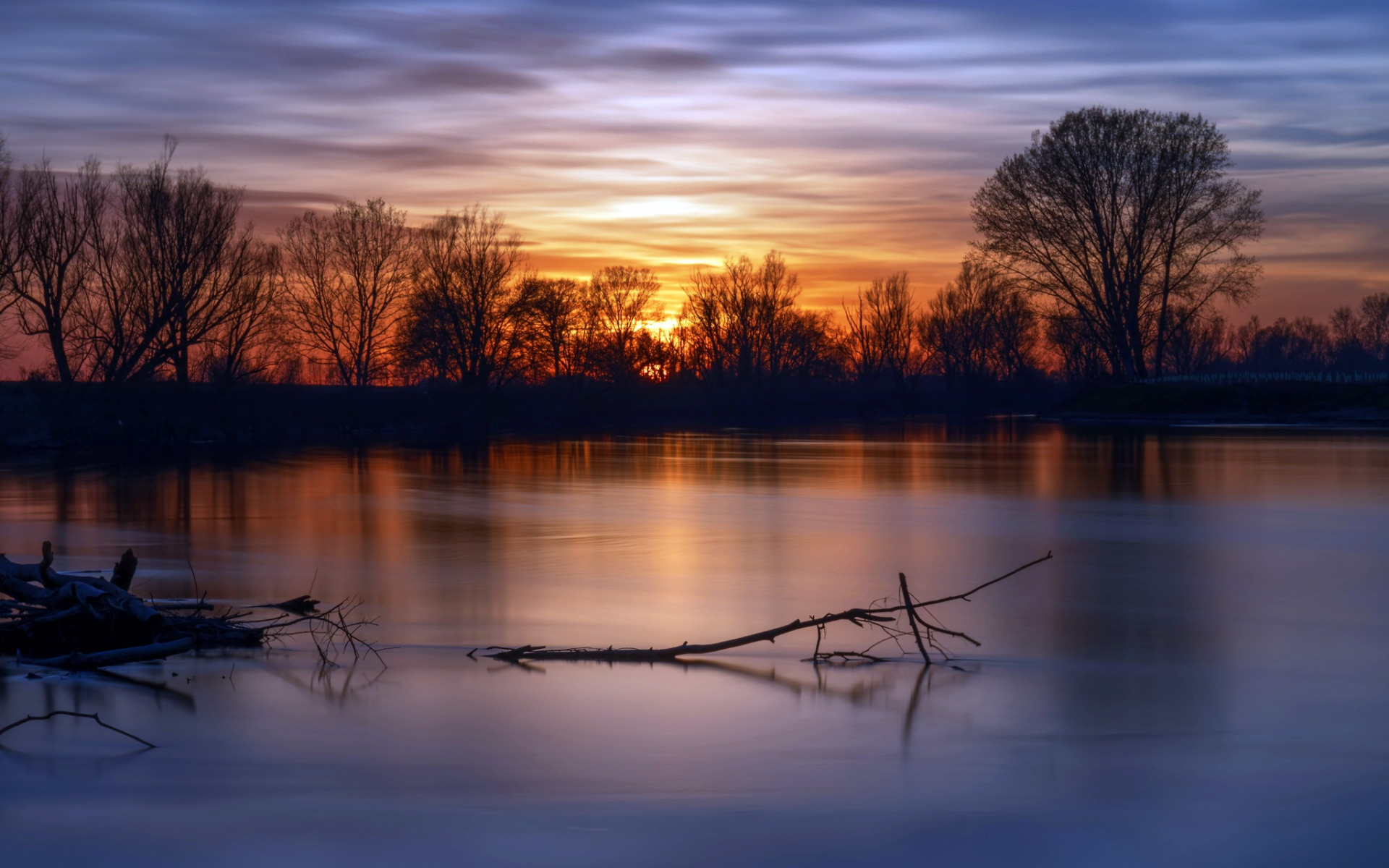 Description: A sunset over a lake with a tree branch in the foreground and a few clouds in the background.