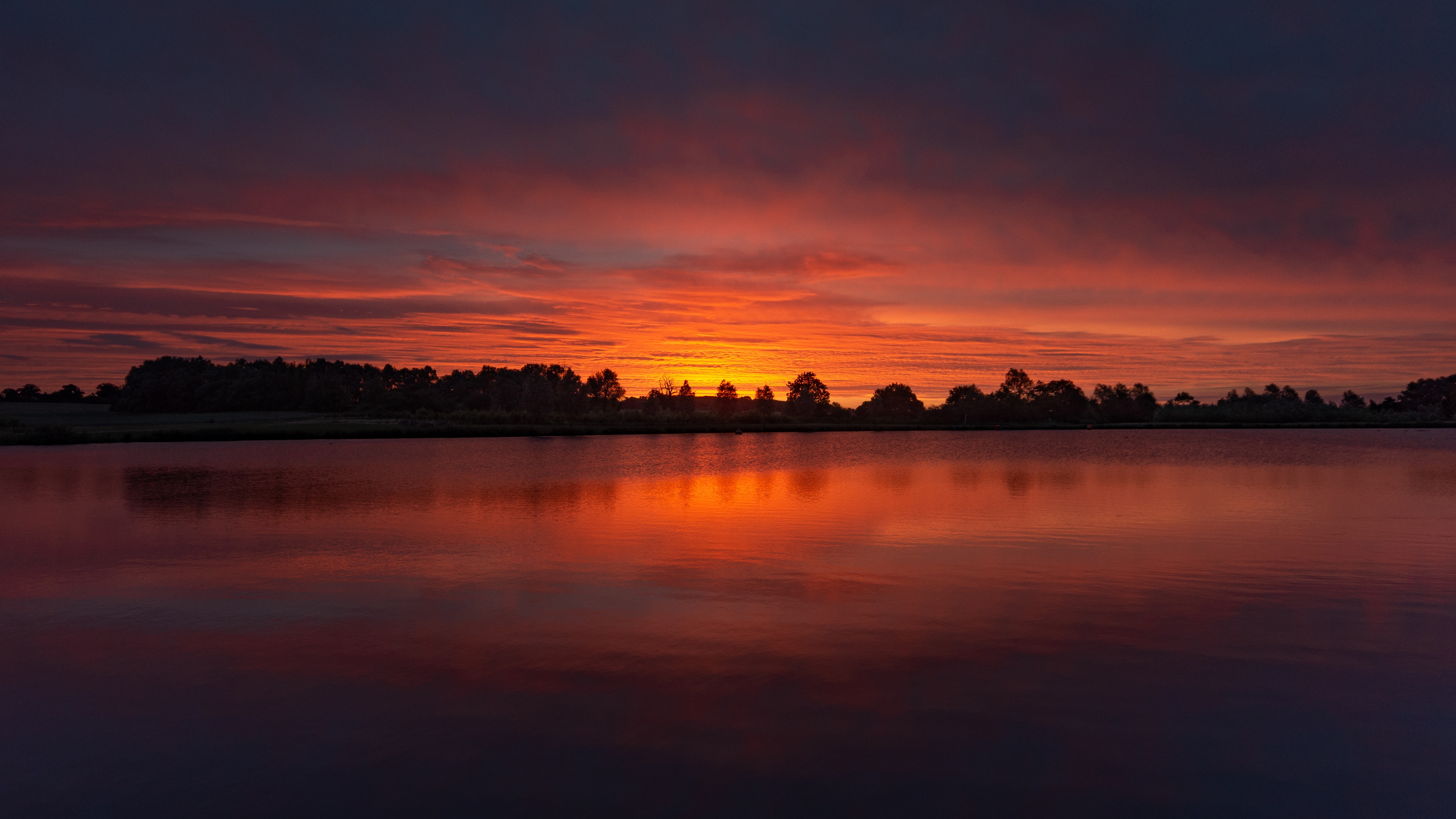 Description: A sunset over a lake with trees in the background and a cloudy sky above it with a few clouds.
