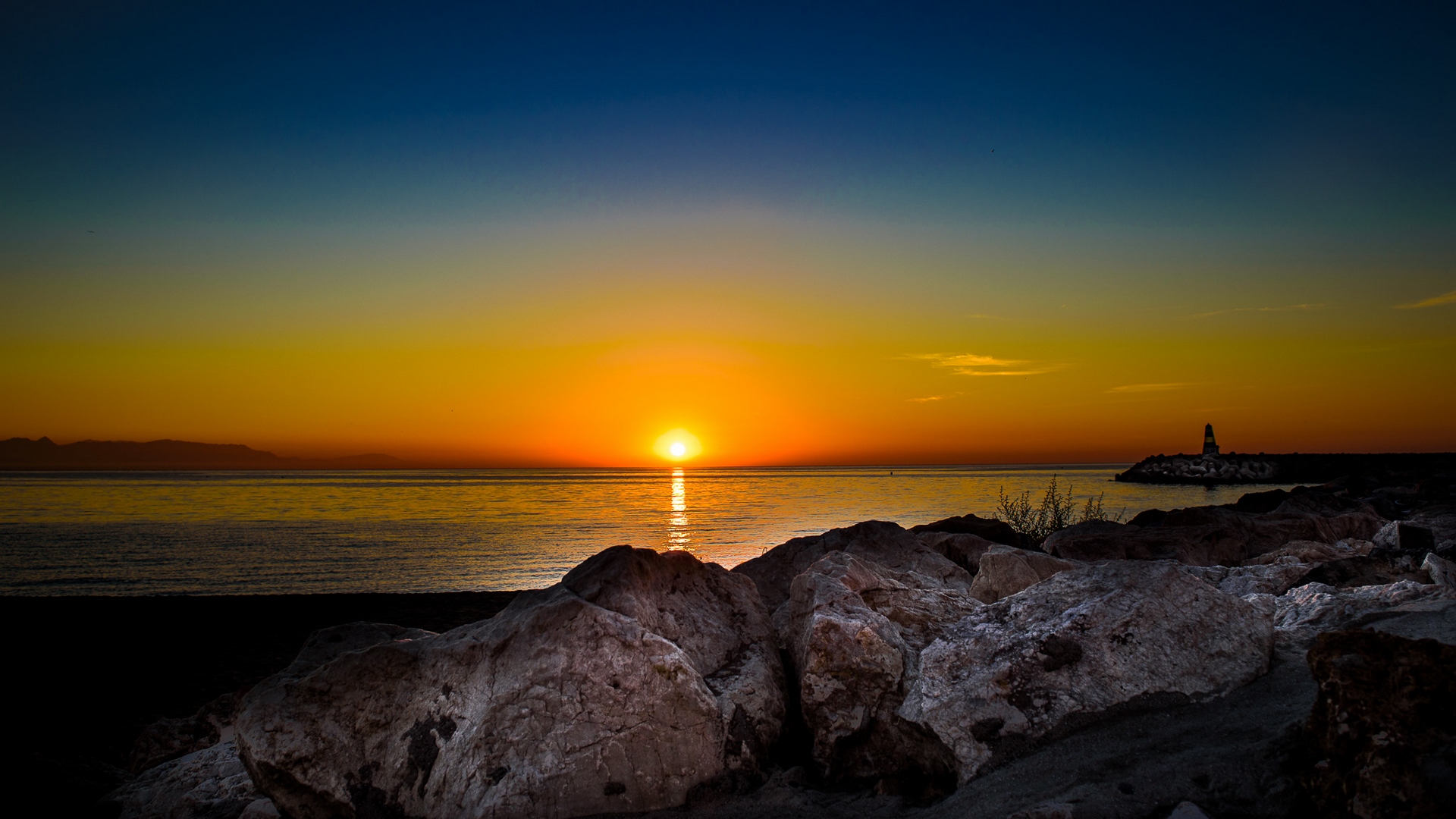 Description: A sunset over a body of water with a lighthouse in the distance and rocks in the foreground and a boat in the distance.