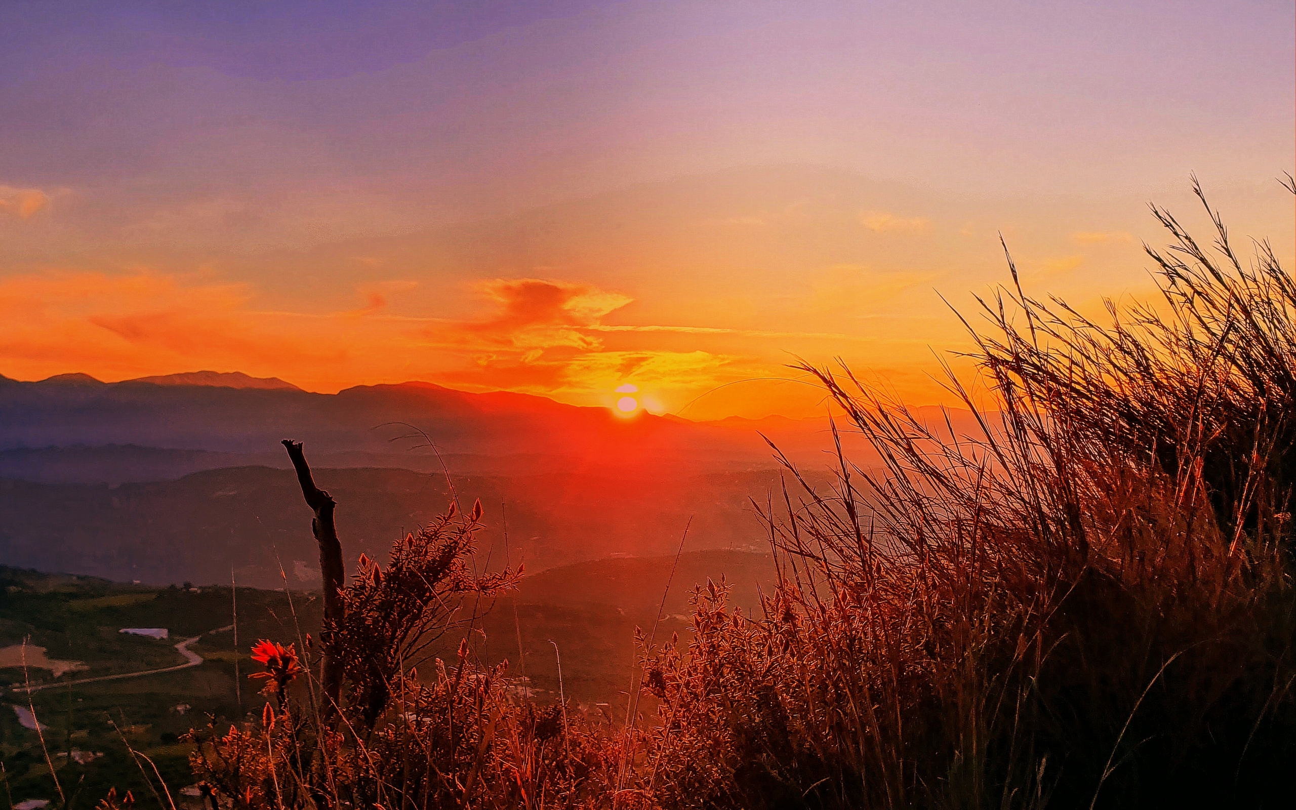 Description: A sunset over a mountain with a few clouds in the sky and a few flowers in the foreground.