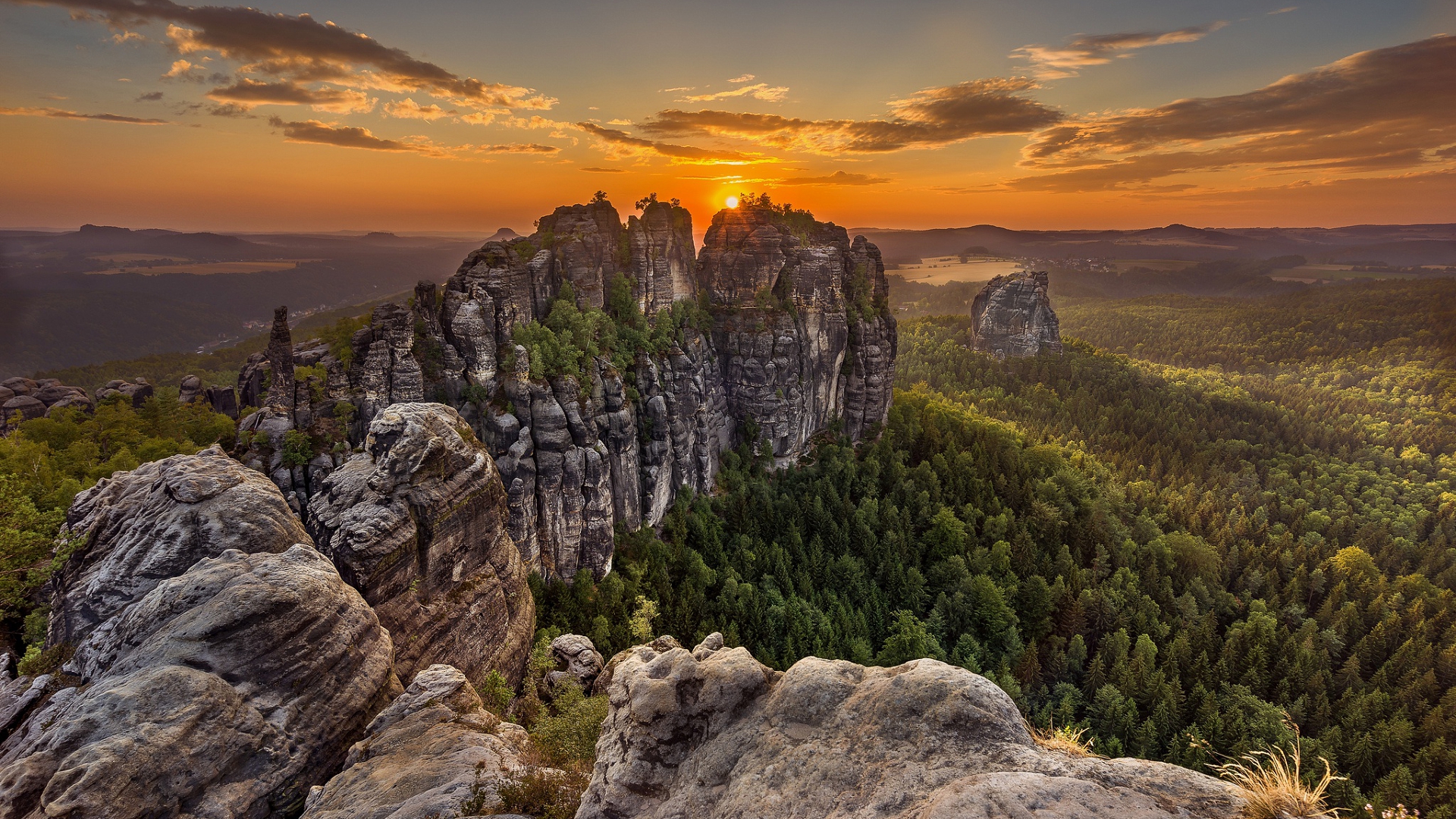 Description: A sunset over a rocky mountain with a forest below it and a sun setting in the distance over the mountains.