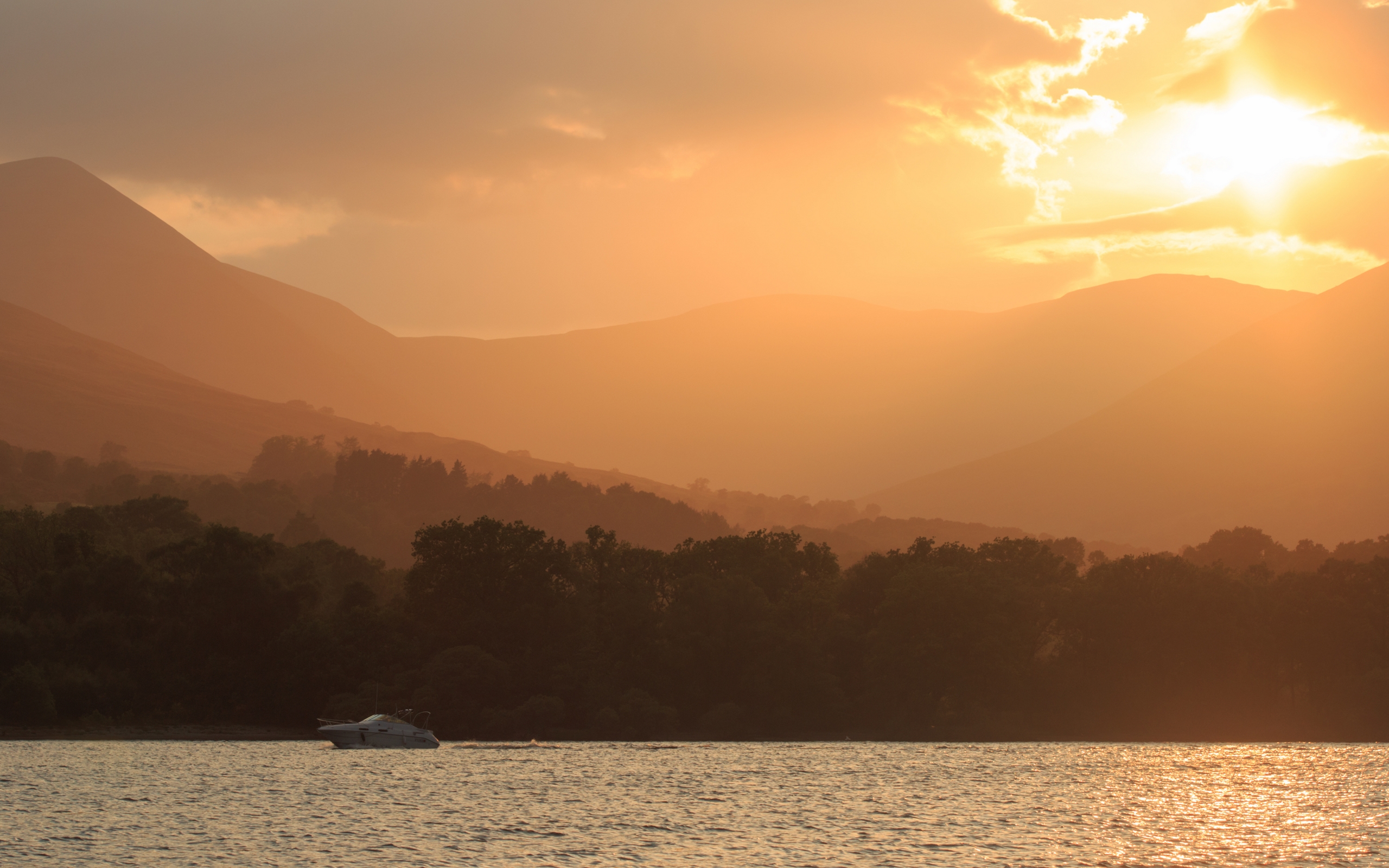 Description: A boat is in the water near a mountain range at sunset or sunrise time with the sun shining through the clouds.