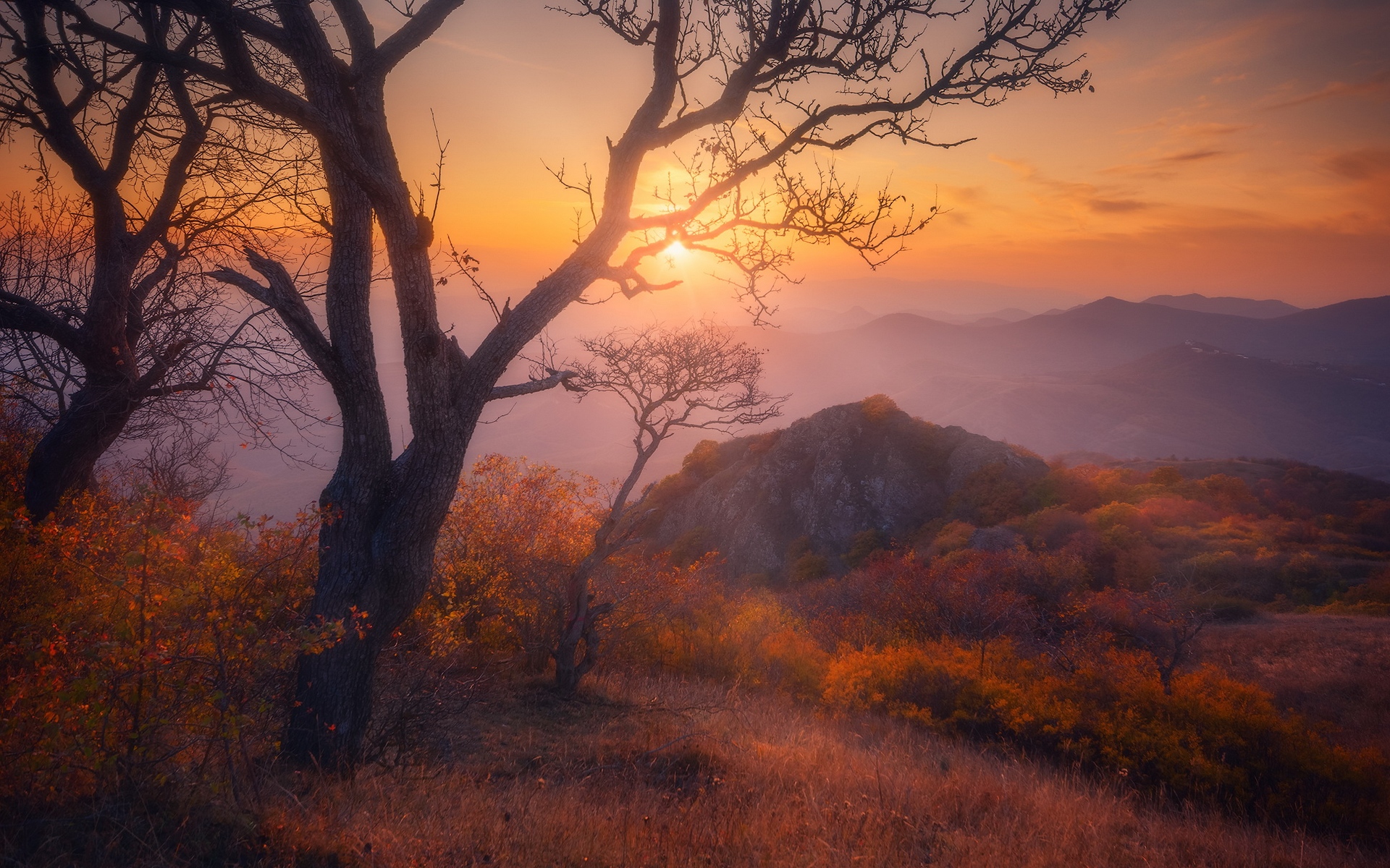 Description: A sunset over a mountain with a tree in the foreground and a foggy sky in the background.