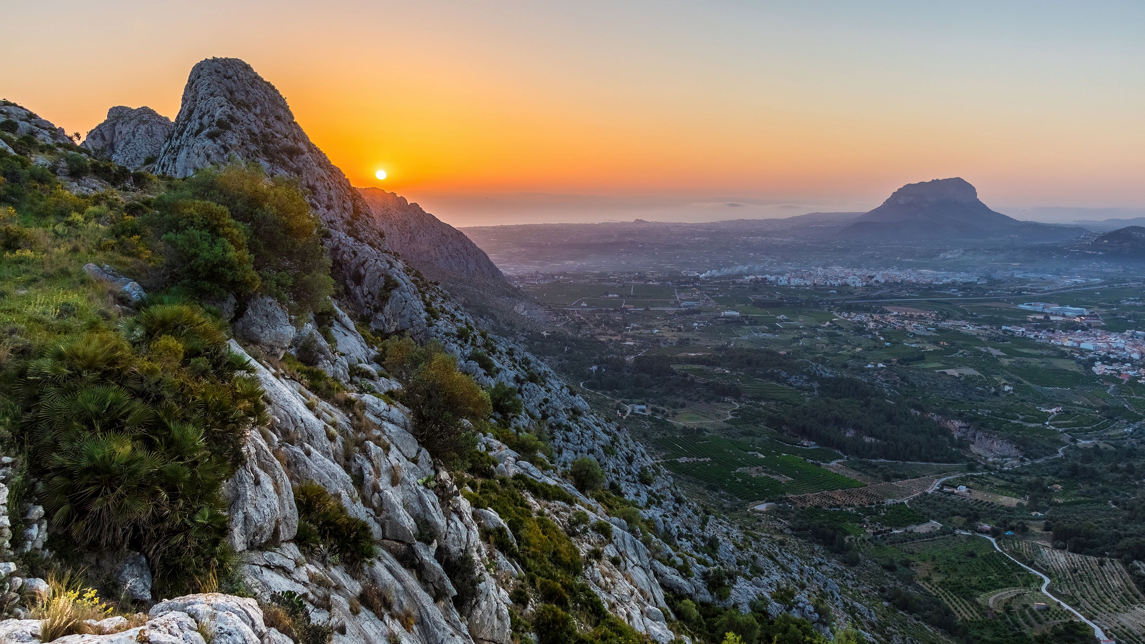 Description: A sunset view of a mountain with a valley below it and a city below it.