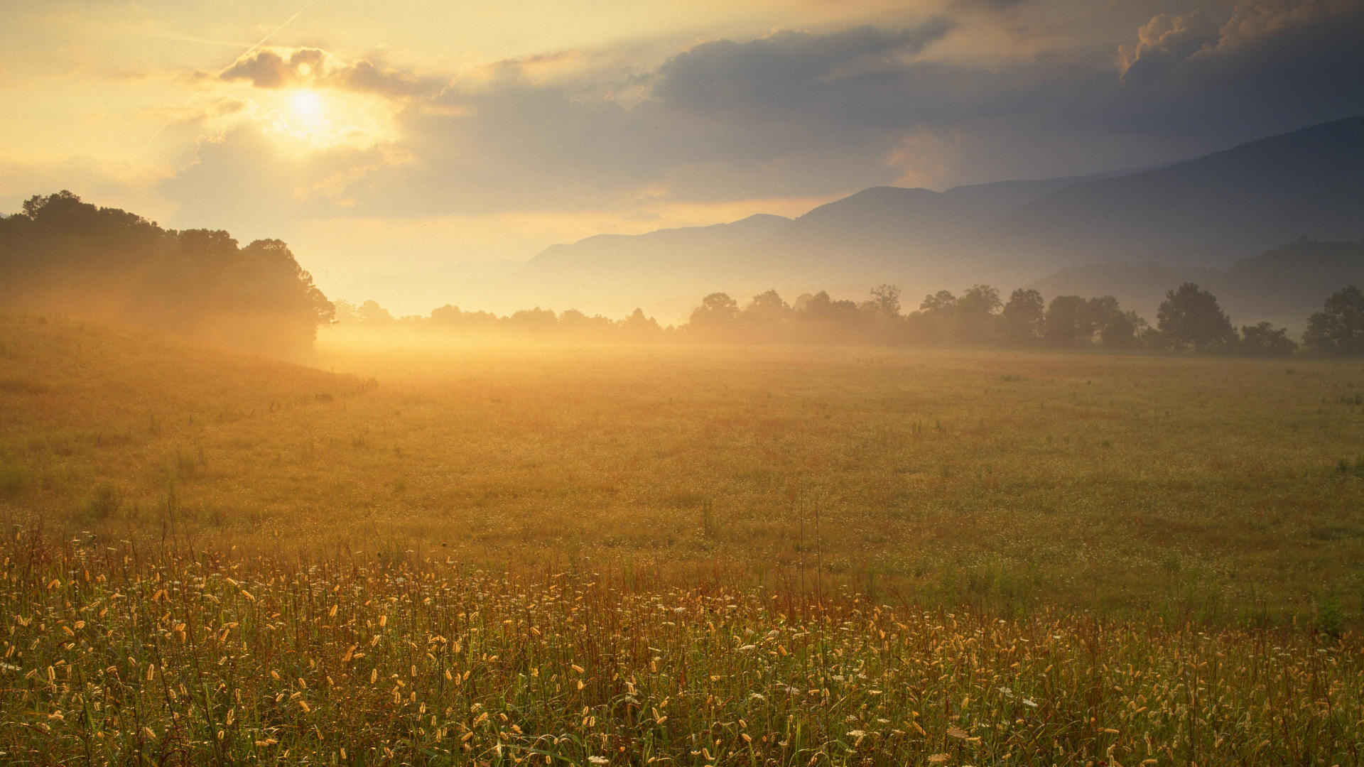 Description: A field with a horse in the distance and a sun setting in the background with mountains in the distance.