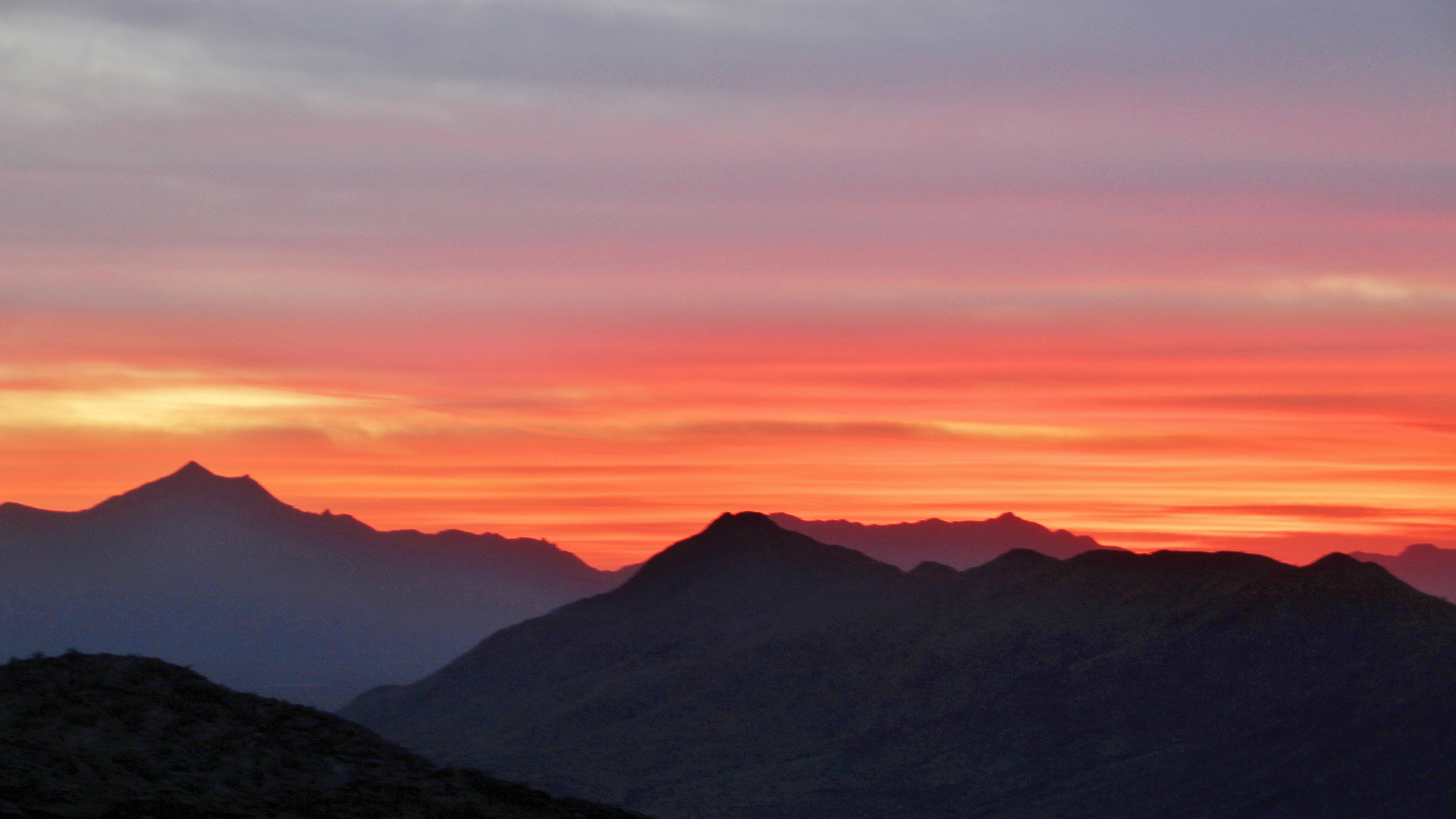 Description: A sunset view of mountains with a red sky in the background and a few clouds in the sky above.