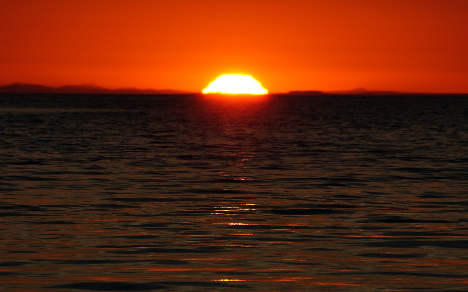 Description: A sunset over the ocean with a boat in the water and a bird flying in the air above the water.