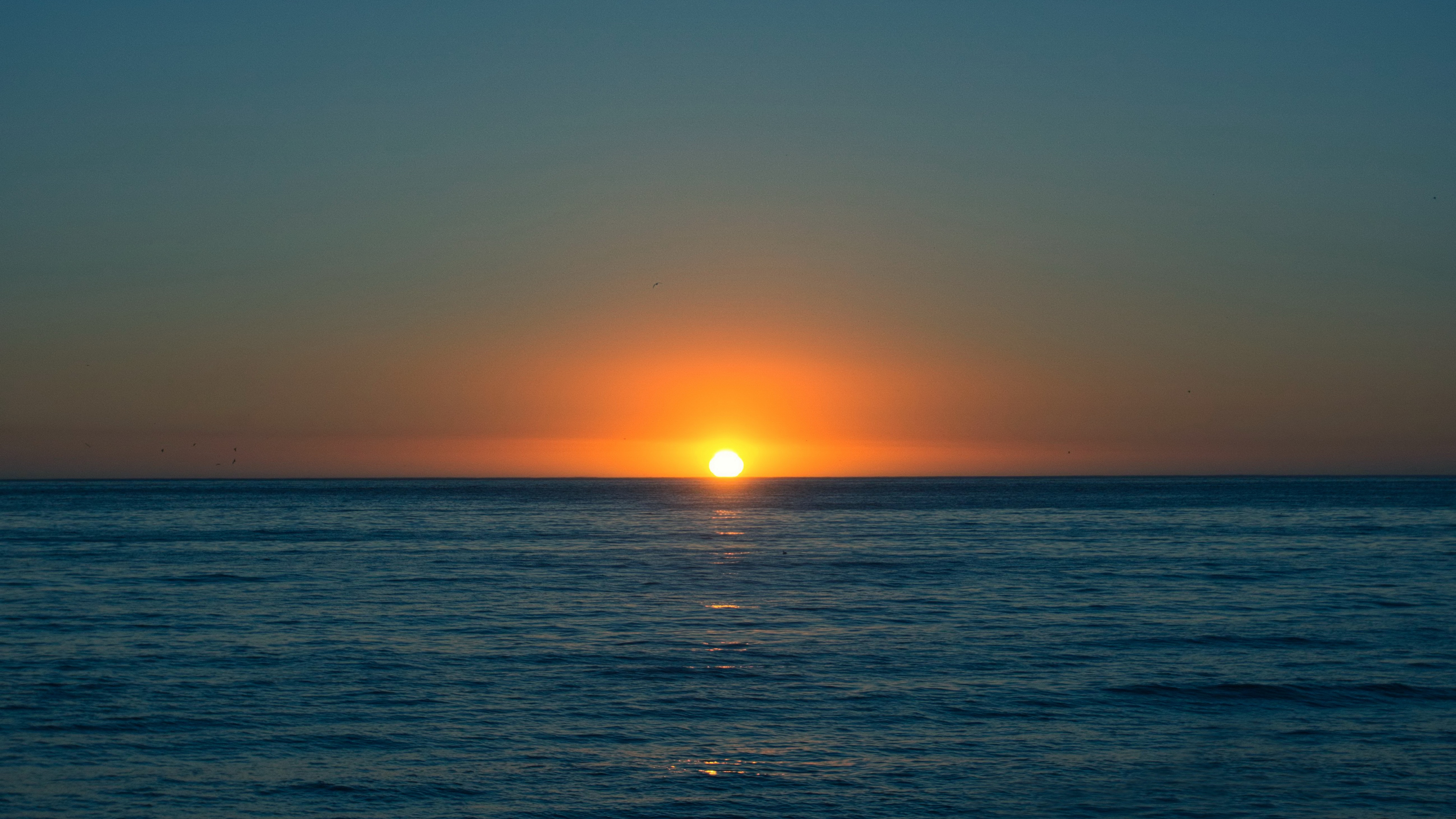 Description: A sunset over the ocean with a boat in the distance and a bird flying in the sky above the water.