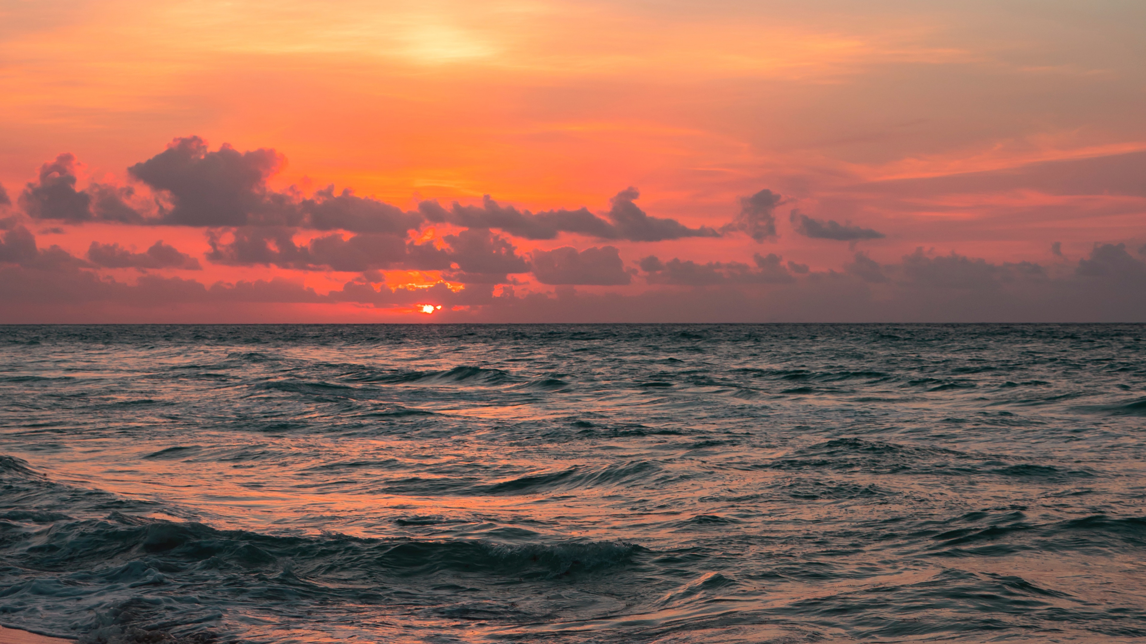 Description: A sunset over the ocean with a boat in the water and clouds in the sky above it and a beach with a surfboard in the foreground.