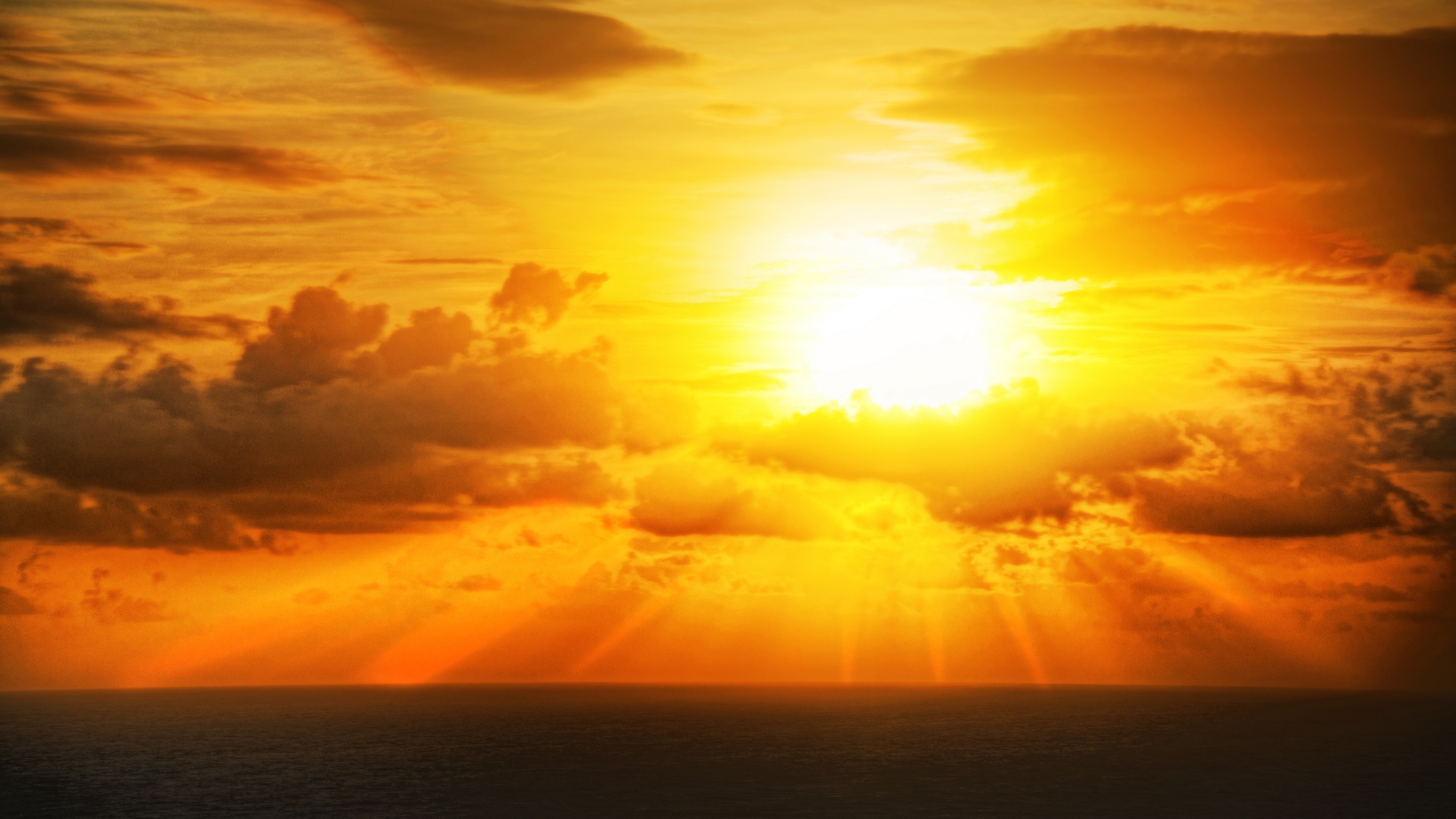 Description: A sunset over the ocean with a boat in the water and clouds in the sky above it and a boat in the water.