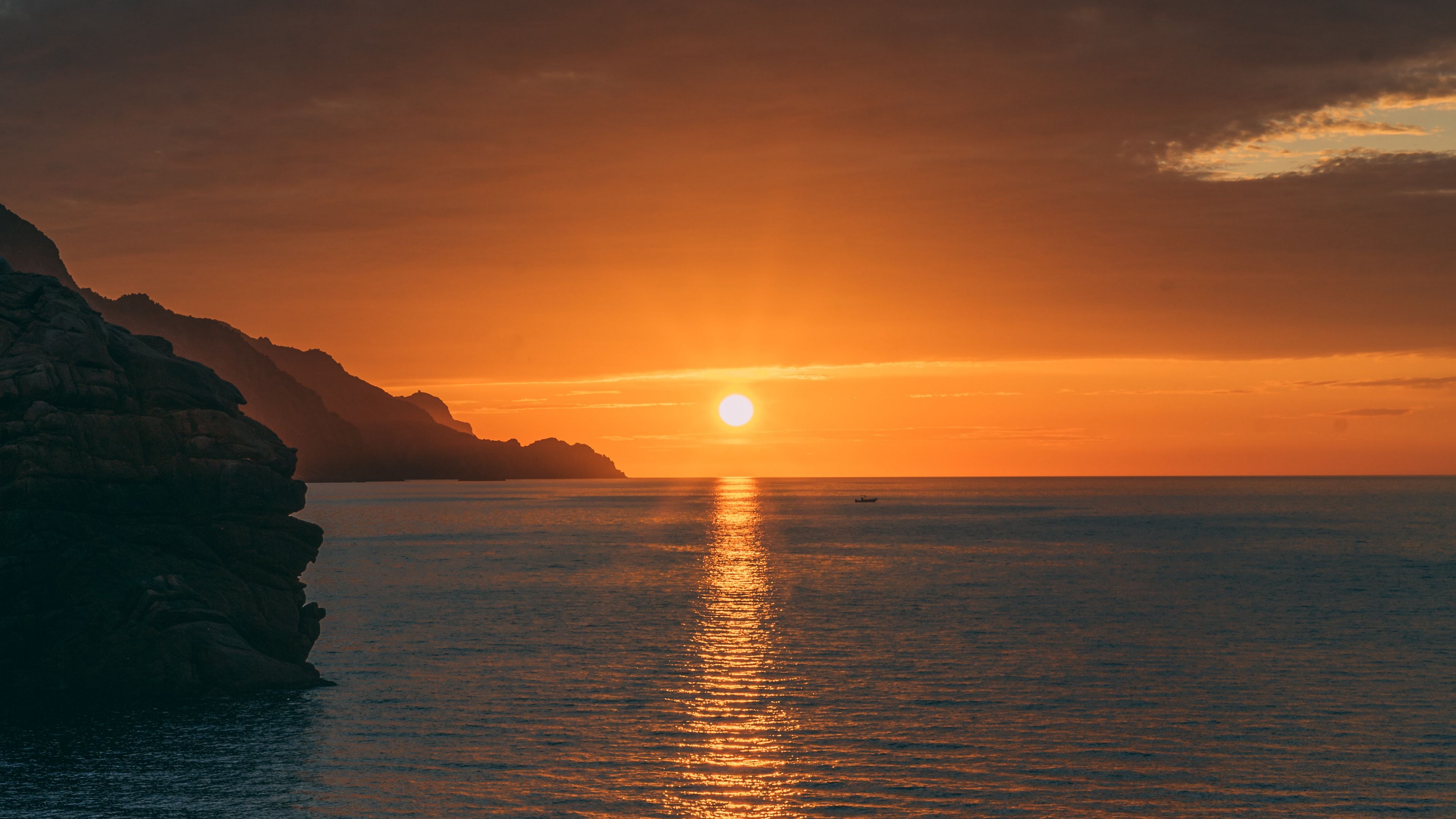 Description: A sunset over the ocean with a boat in the water and a mountain in the distance with a boat in the water.