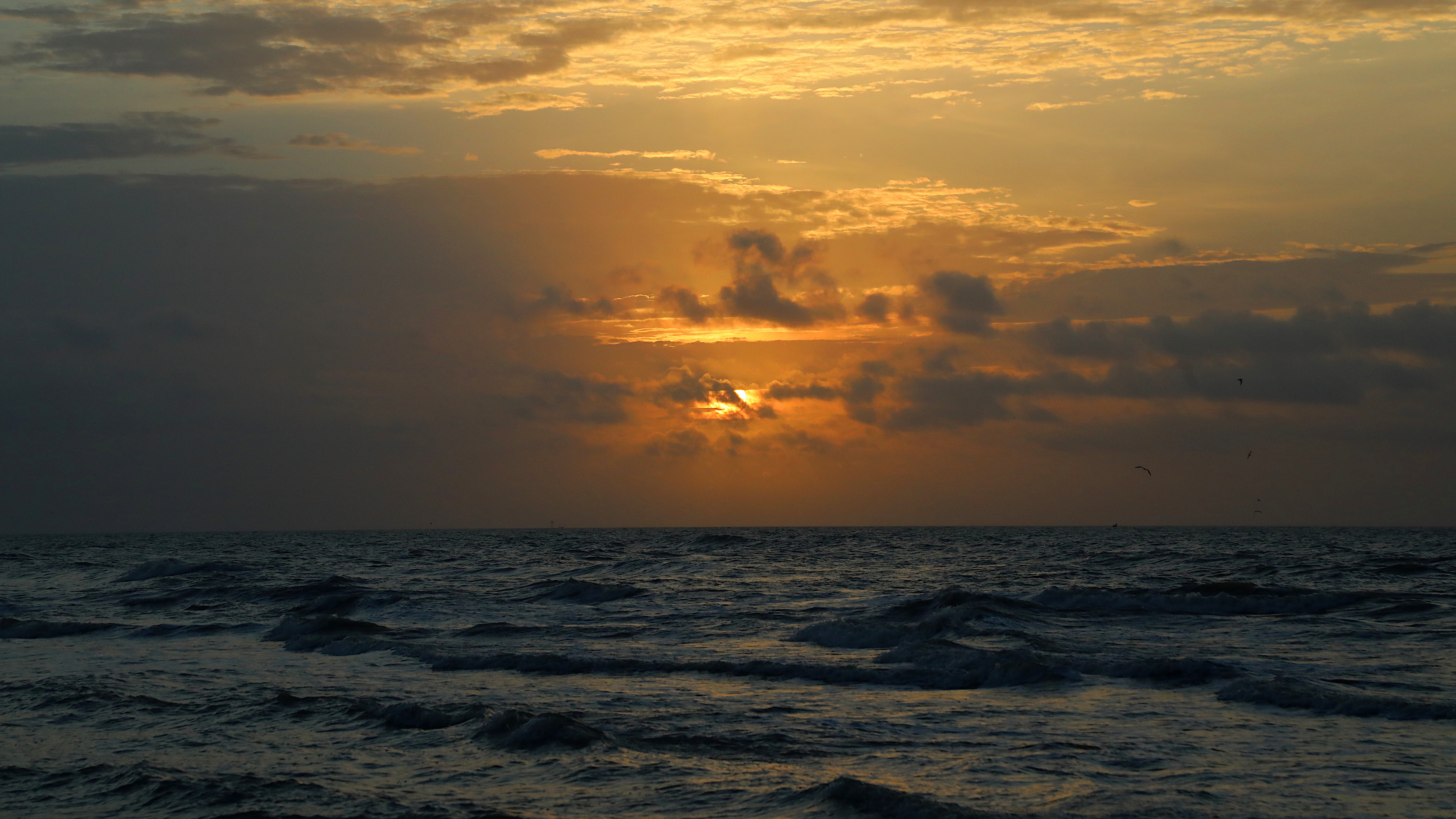 Description: A sunset over the ocean with a few clouds in the sky and a bird flying in the distance with a sun setting in the distance.