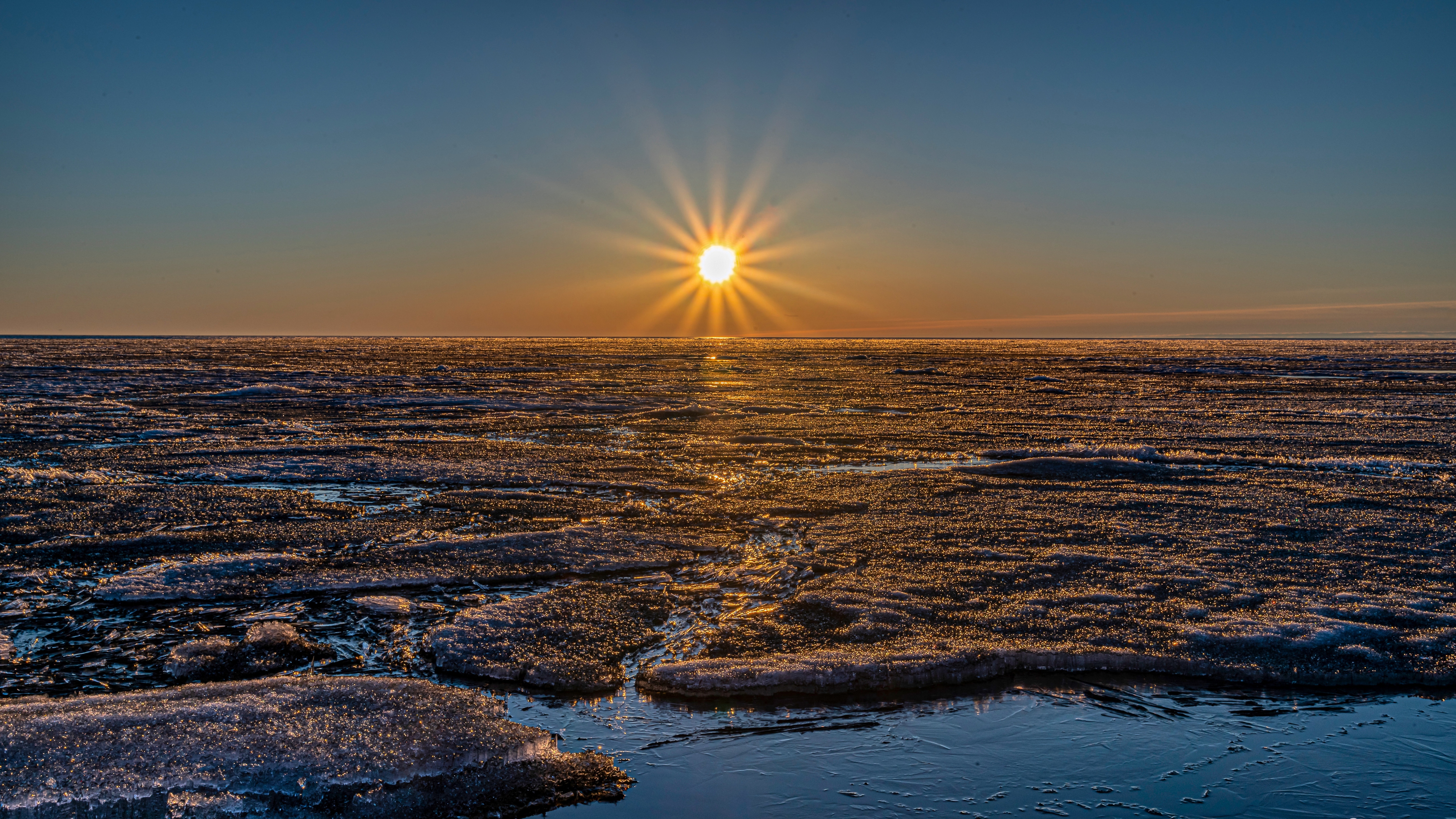 Description: The sun is setting over the ocean with ice floes in the foreground and a body of water in the foreground.