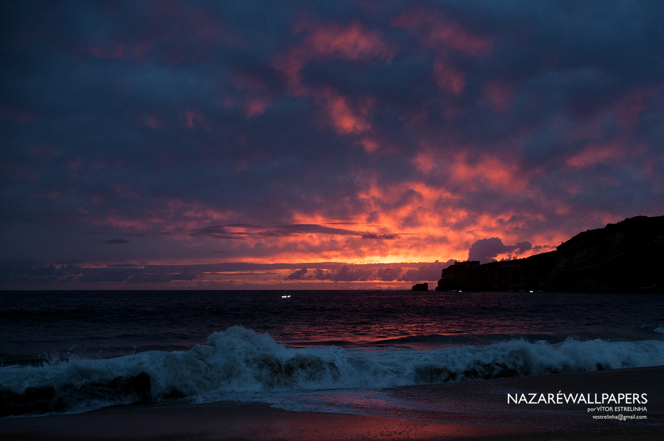 Description: A sunset over the ocean with a small island in the distance and a boat in the water at the end of the day.