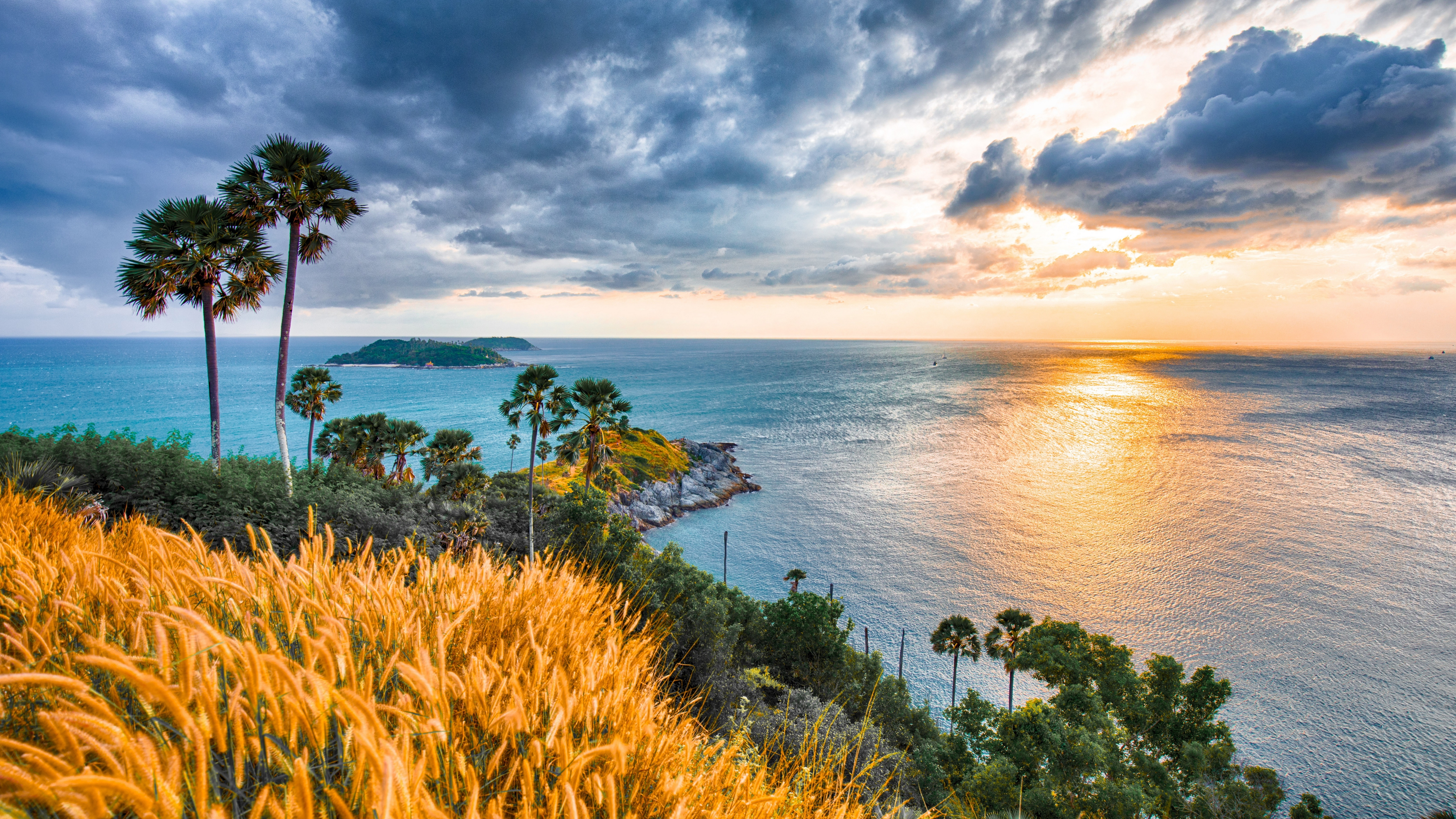 Description: A beautiful sunset over the ocean with palm trees and a cliff on the other side of the water with a small island in the distance.