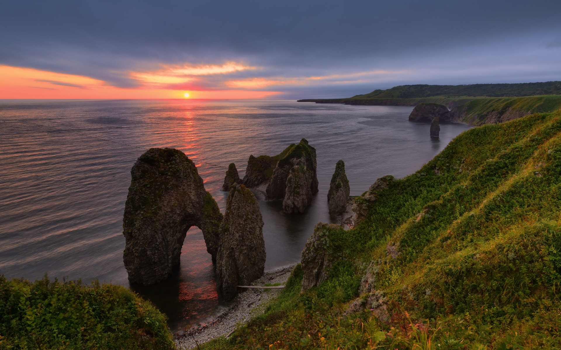 Description: A sunset over the ocean with rocks in the foreground and a body of water in the background with a rocky outcropping.