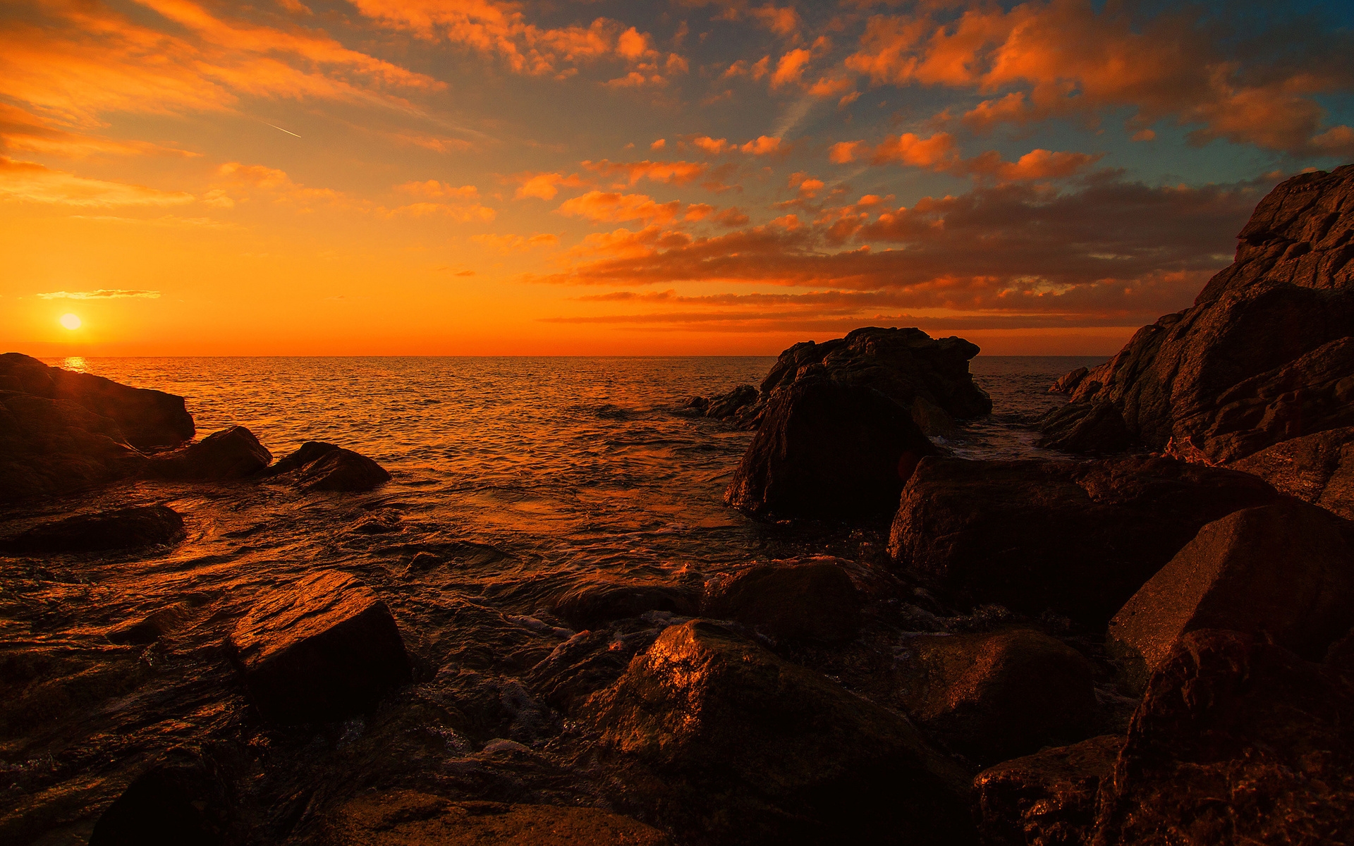 Description: A sunset over the ocean with rocks and water in the foreground and a bright orange sky above it.
