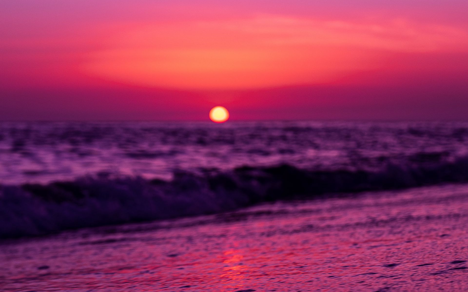 Description: A sunset over the ocean with a surfer in the water and a wave coming in to shore and a person walking on the beach.
