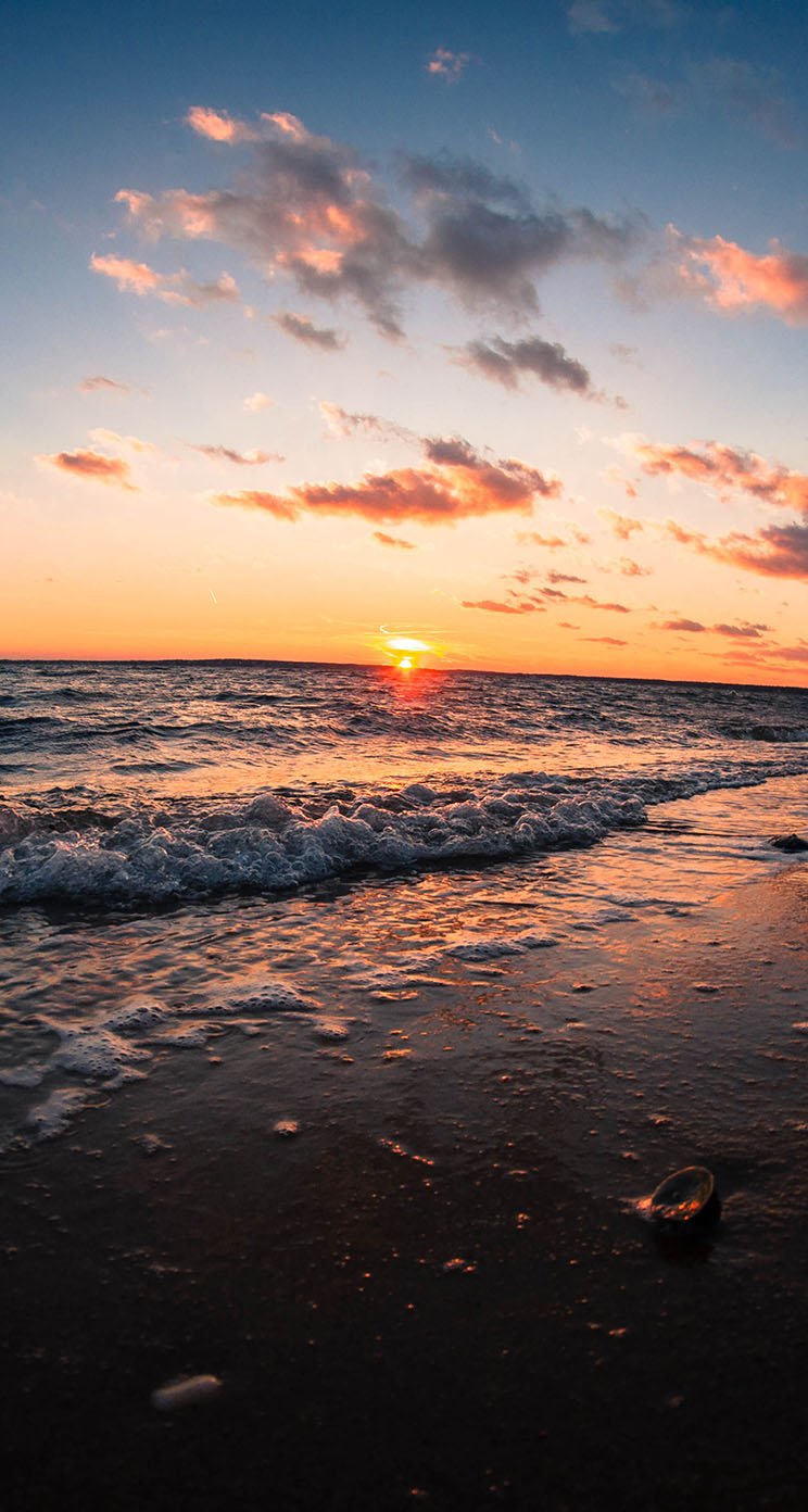 Description: A sunset over the ocean with a surfboard in the foreground and a small wave coming in to shore.