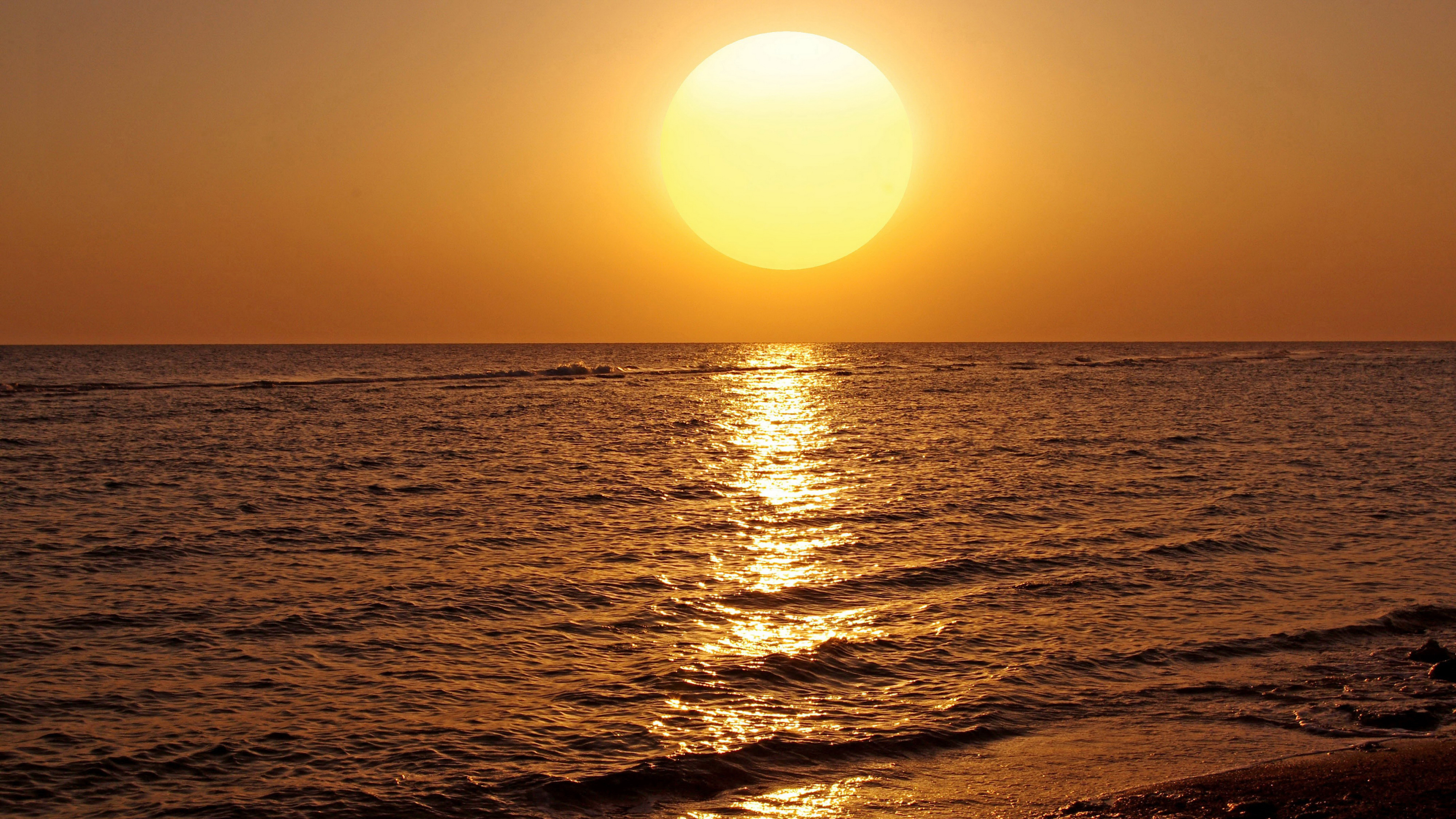 Description: A sunset over the ocean with a surfer in the water and a boat in the distance with a person on the shore.