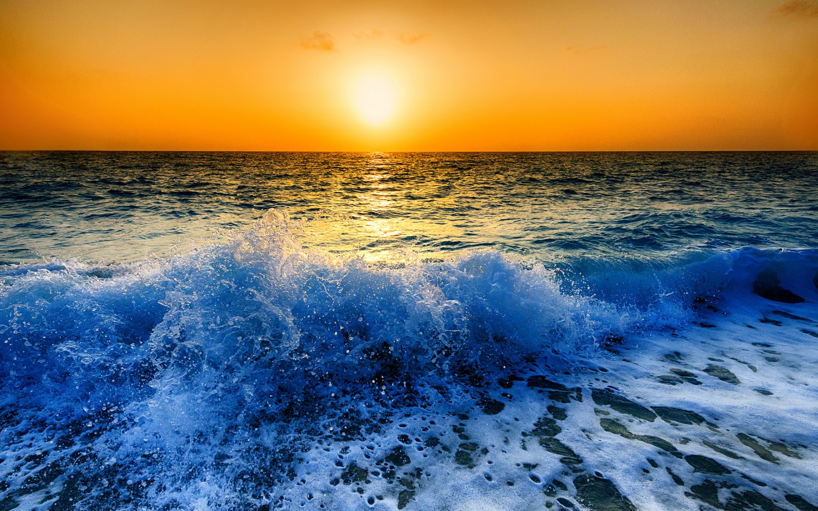 Description: A sunset over the ocean with a wave crashing in front of it and a bright orange sky above the ocean.