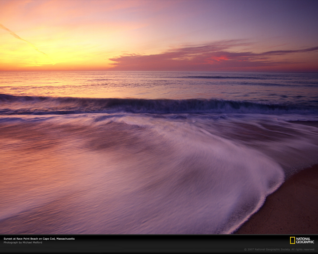 Description: A sunset over the ocean with a wave coming in to shore and a person standing on the beach in the distance.