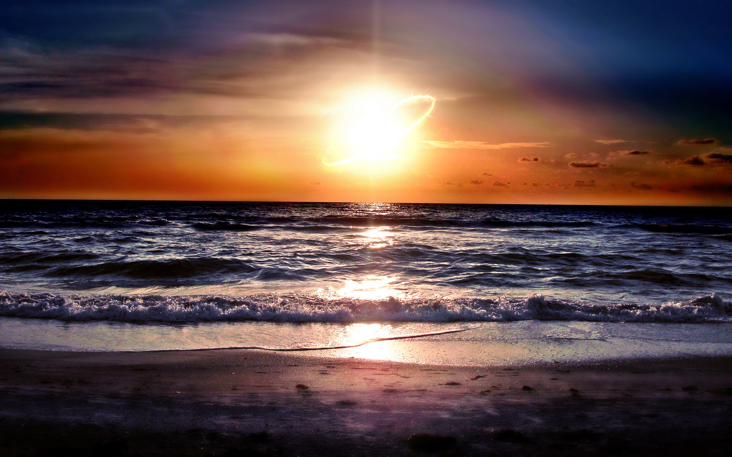 Description: A sunset over the ocean with a wave coming in to shore and a bright sun in the sky above.