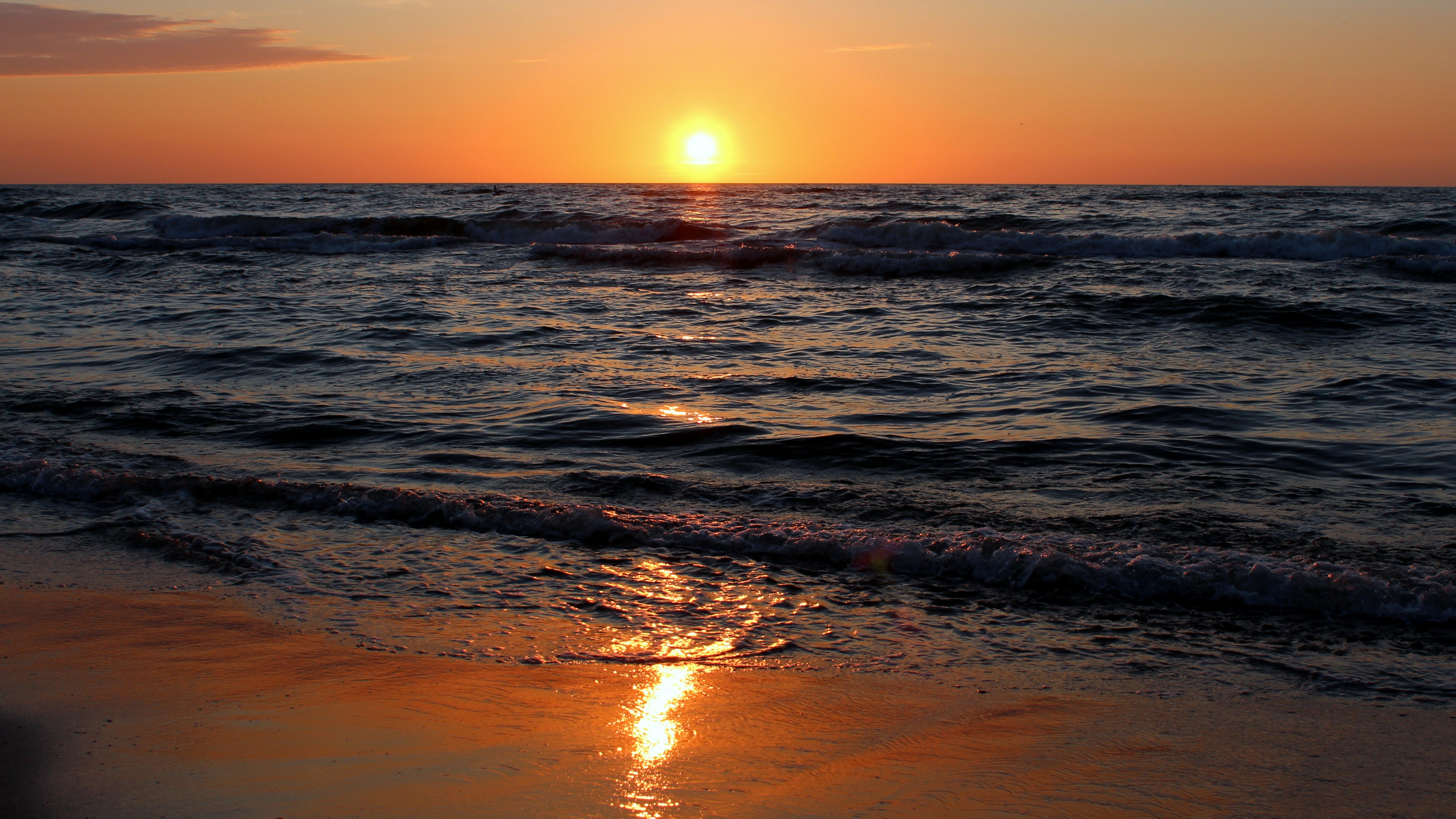Description: A sunset over the ocean with waves coming in to shore and a person standing on the beach in the distance.