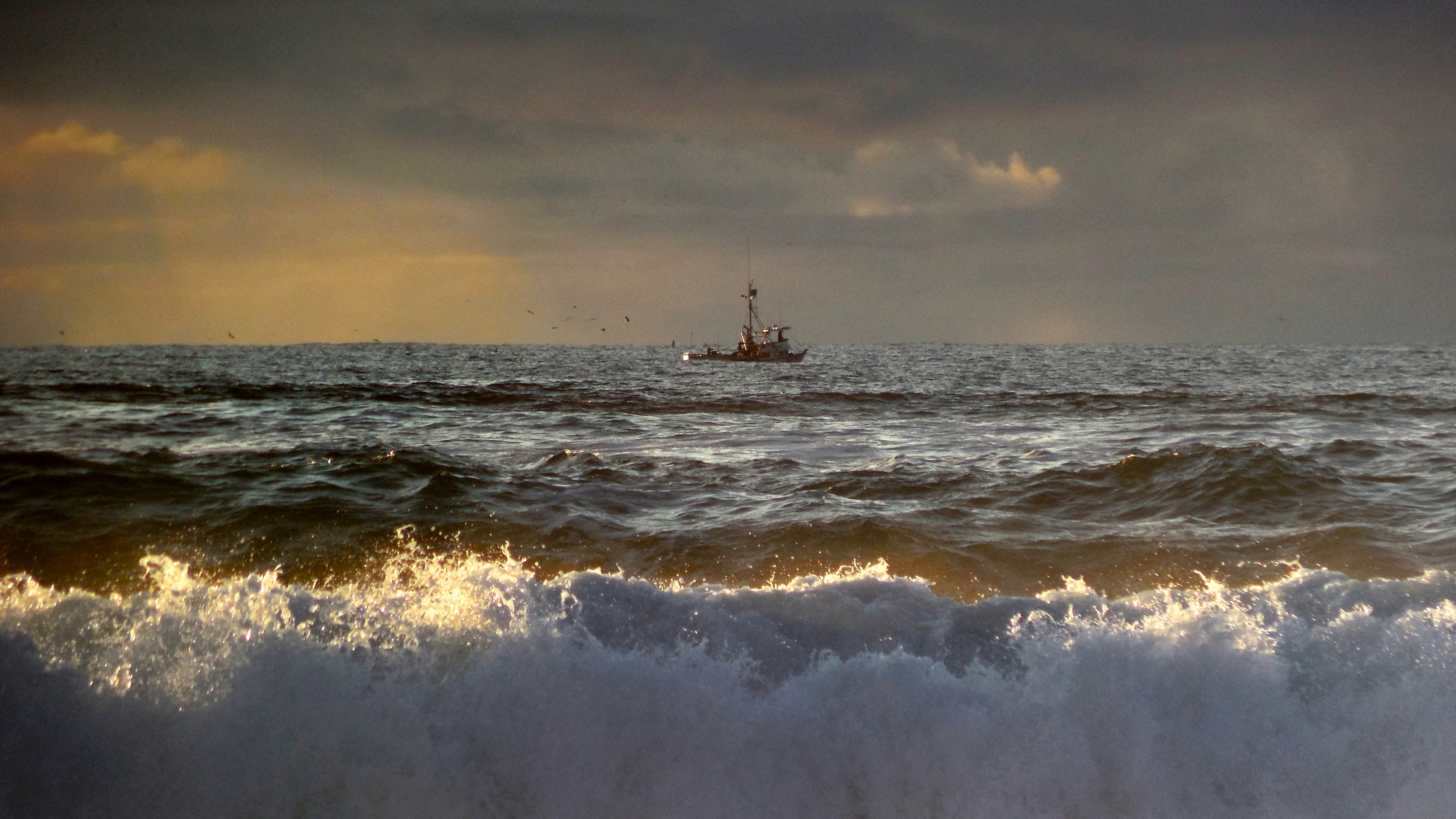 Description: A boat is in the distance on the ocean waves as the sun sets over the horizon and the ocean is dark.