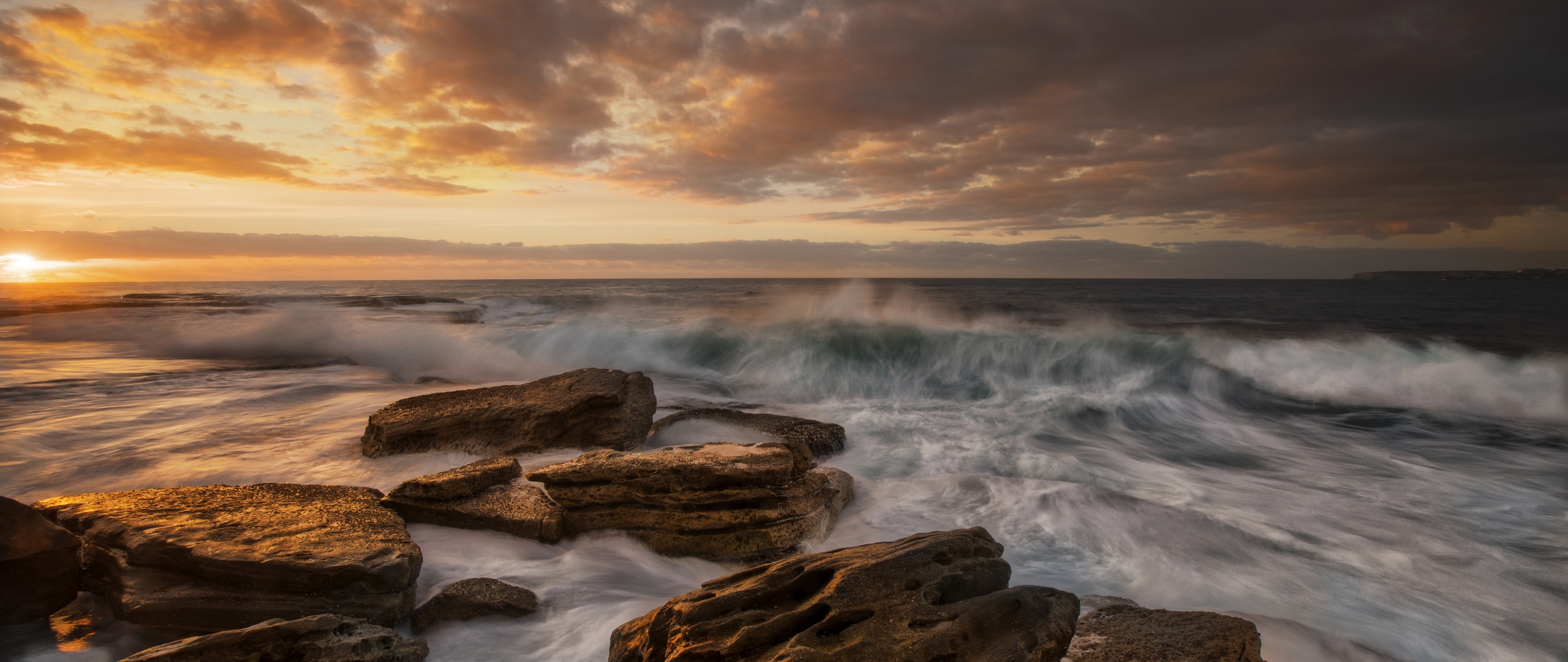 Description: A sunset over the ocean with waves crashing on rocks and a large body of water in the foreground.