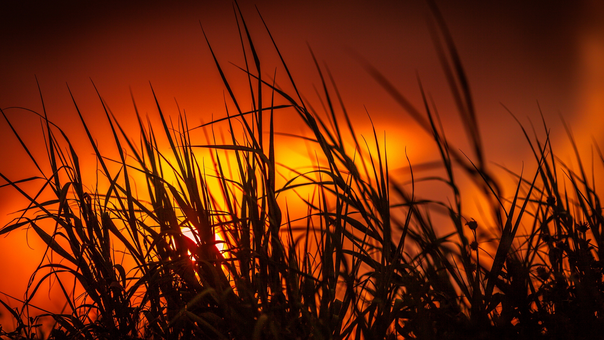 Description: A sunset with a bright orange sky and some tall grass in the foreground and a bright orange sky in the background.