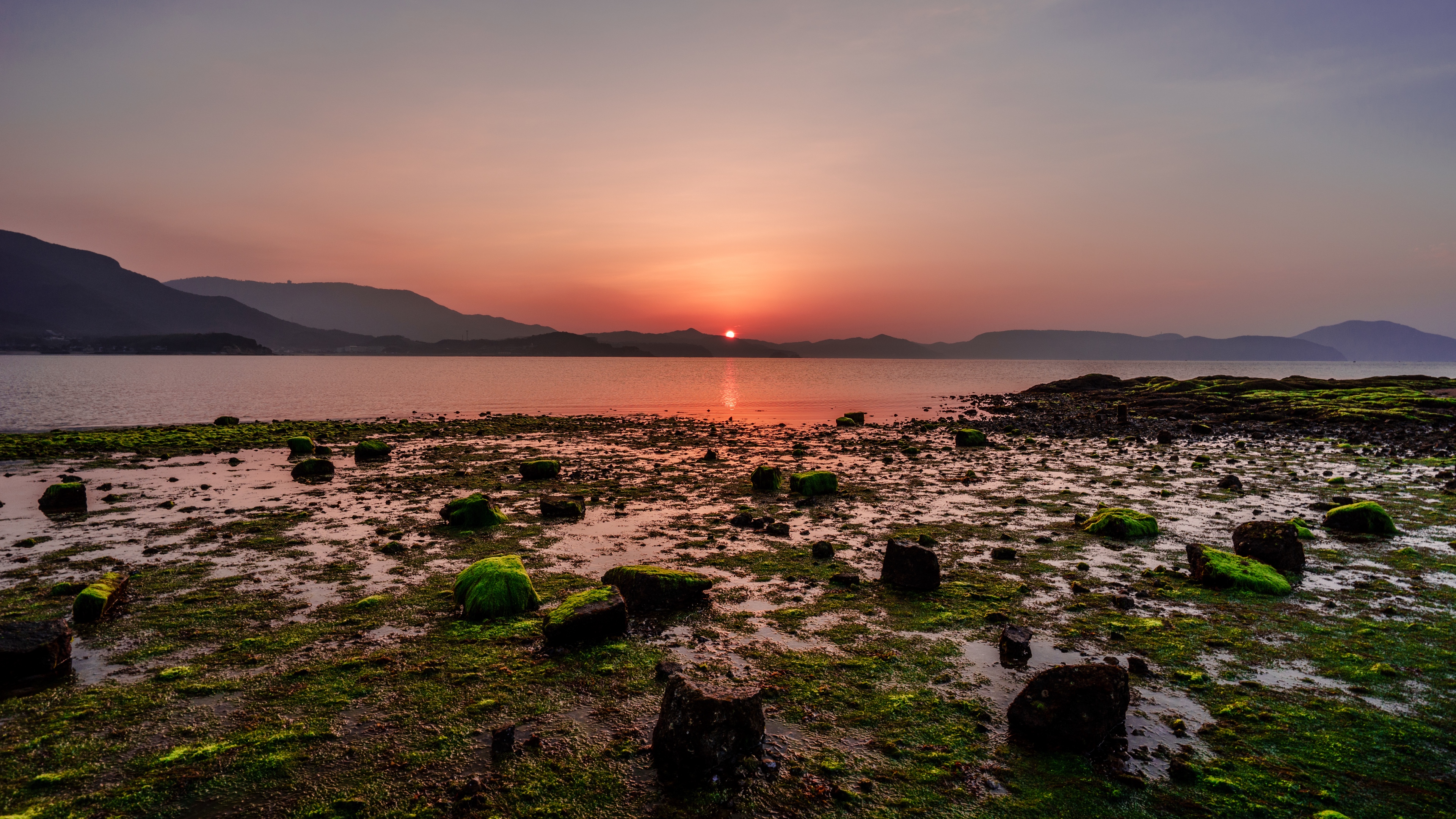 Description: A sunset over a body of water with rocks and grass in the foreground and mountains in the background.