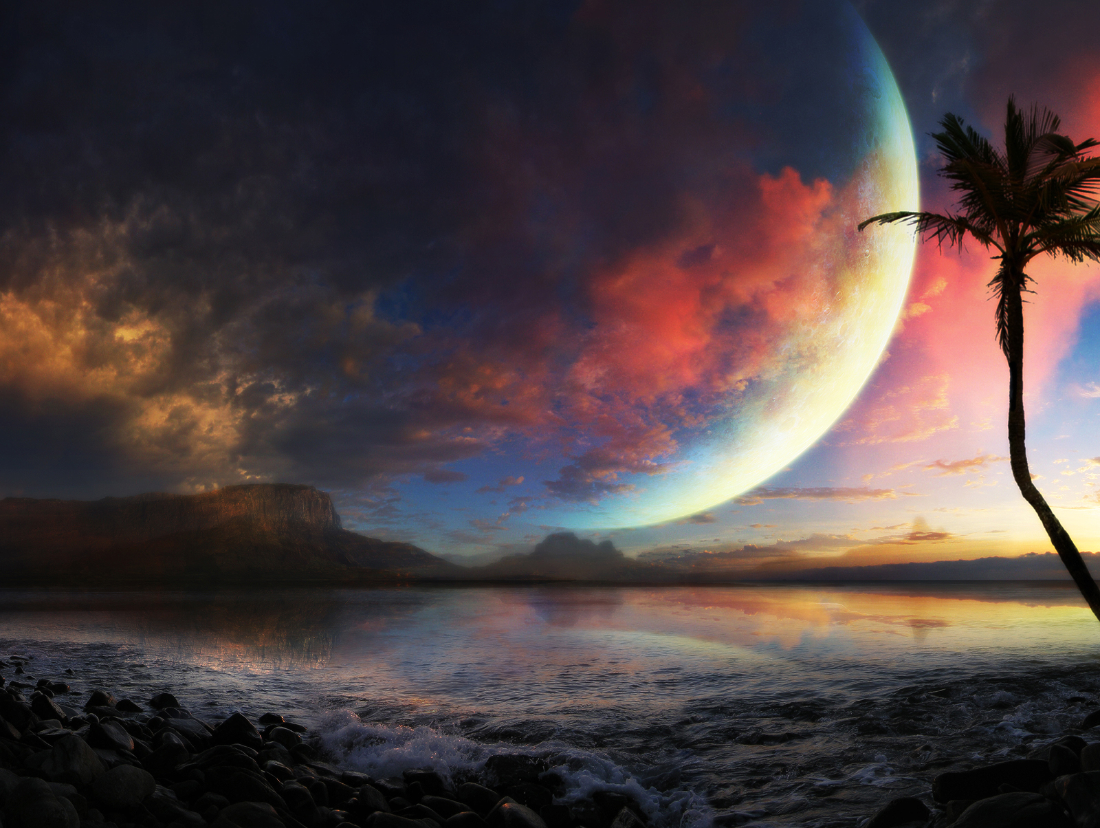 Description: A painting of a sunset with a palm tree in the foreground and a distant mountain in the background.