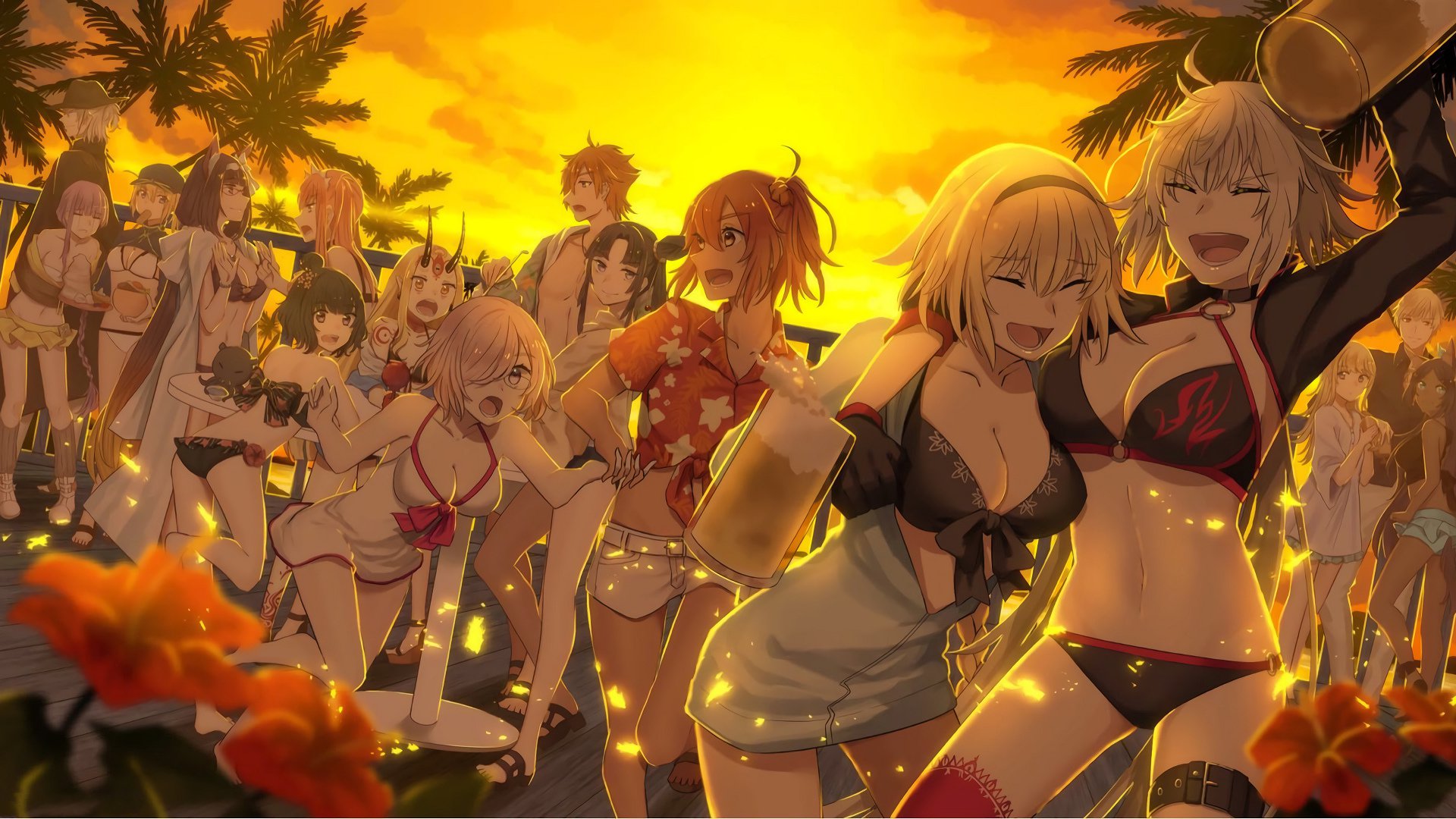 Description: A group of women in bikinis standing in front of a sunset with palm trees and flowers in the background.