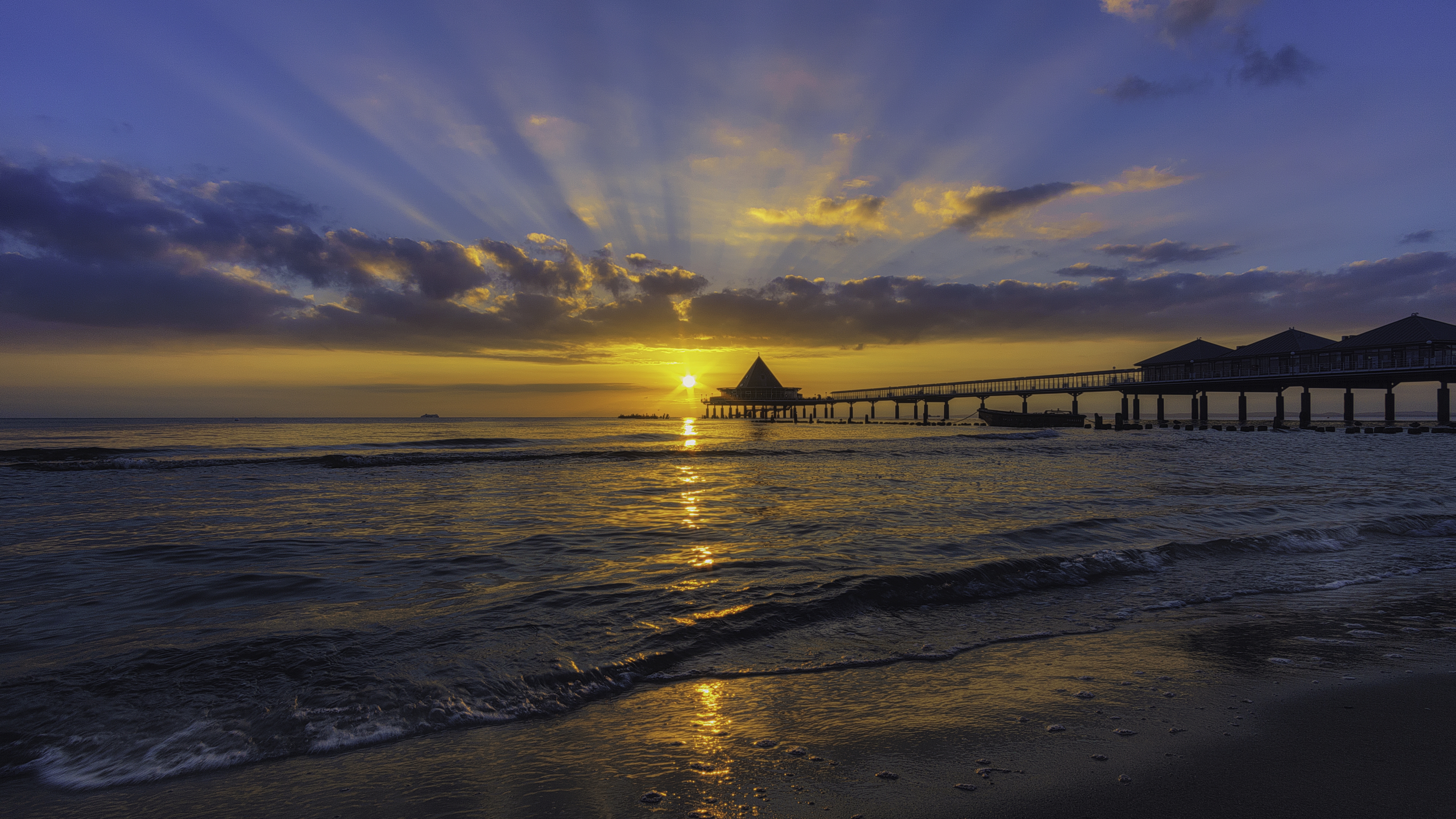 Description: A sunset over a pier with a boat in the water and a pier in the distance with a pier in the distance.