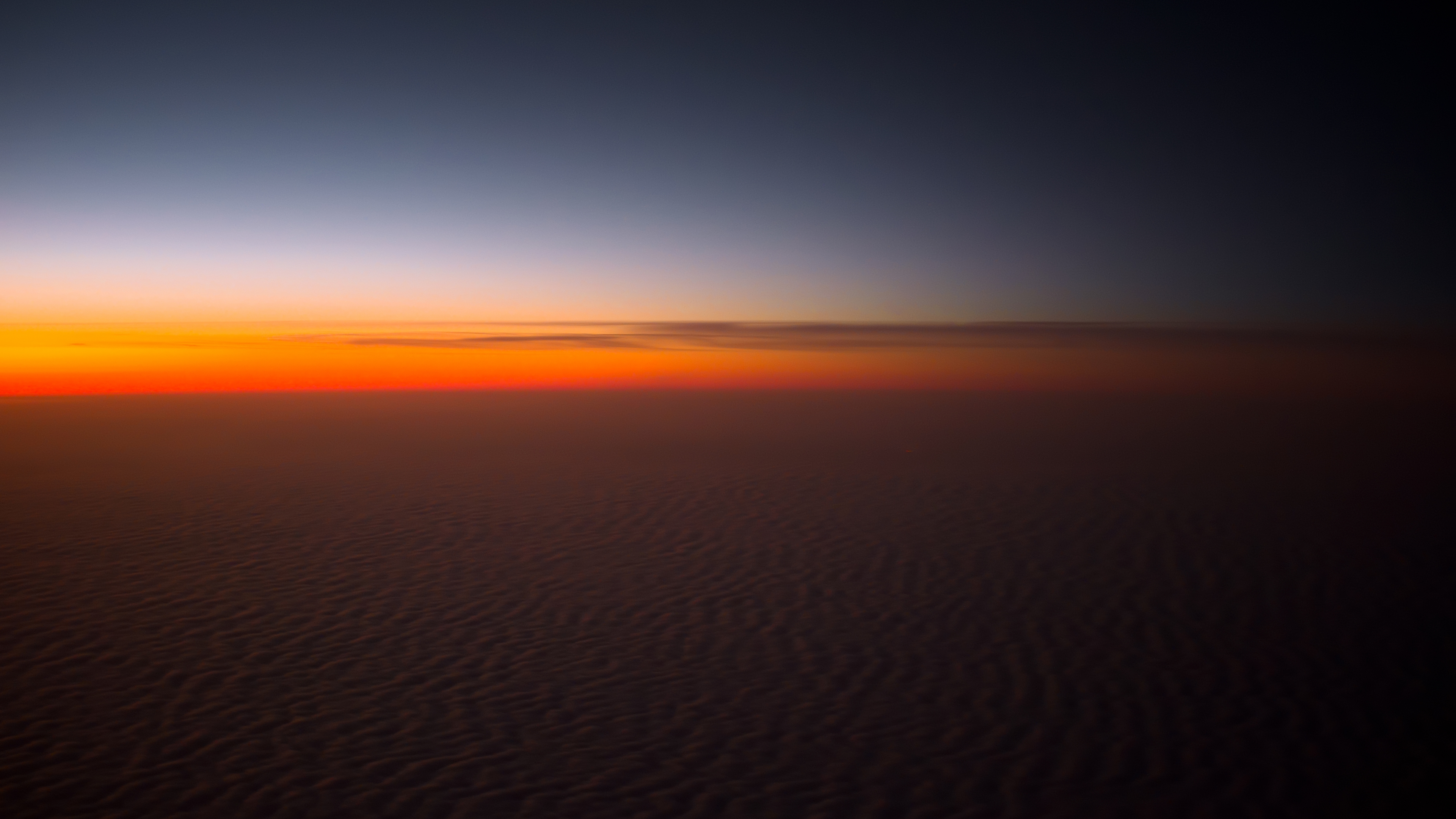 Description: A view of a sunset from an airplane window with a plane wing in the foreground and a dark sky in the background.