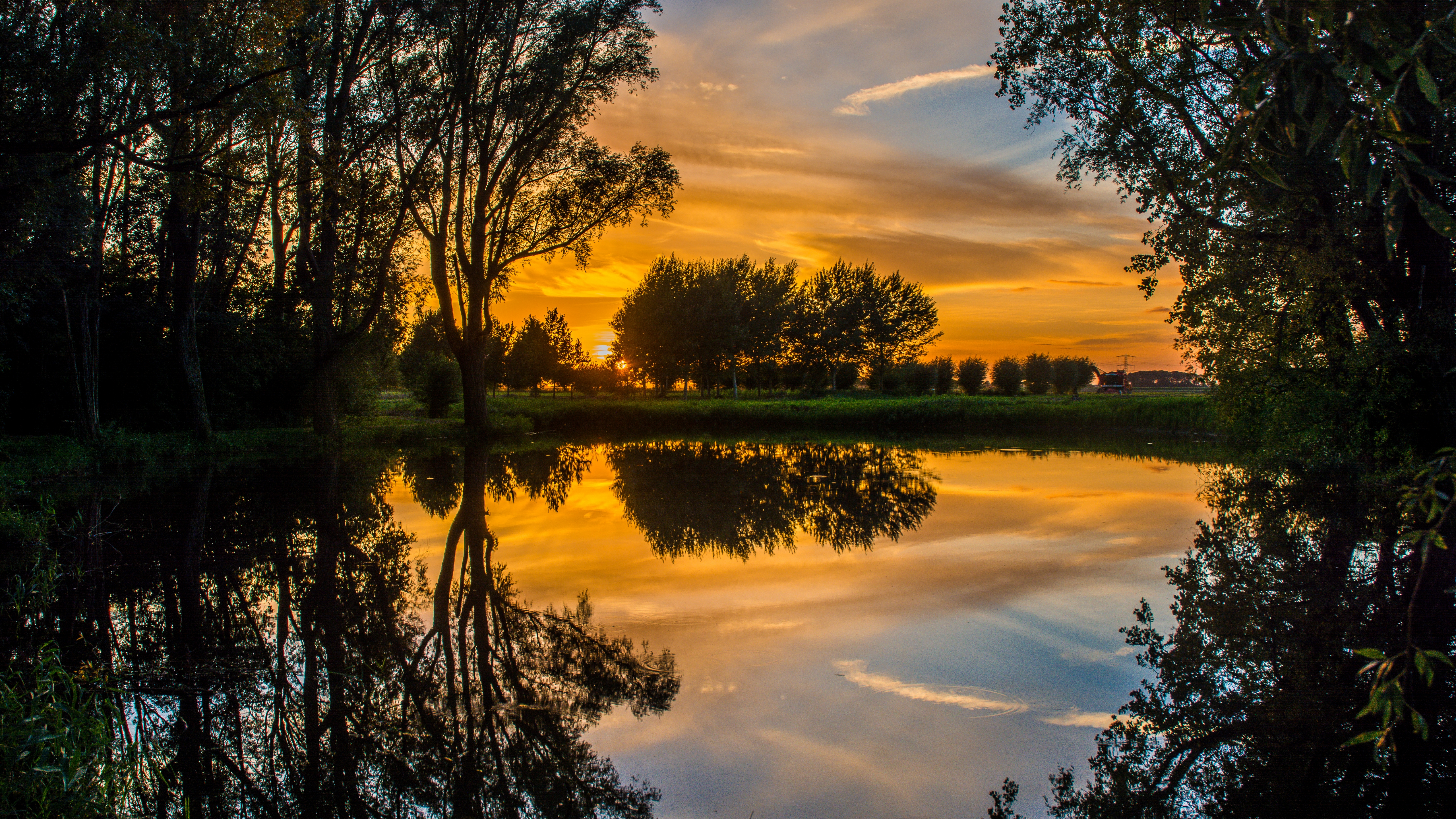 Description: A sunset reflecting the sky and trees in a lake with a reflection of the sun in the water and trees in the foreground.