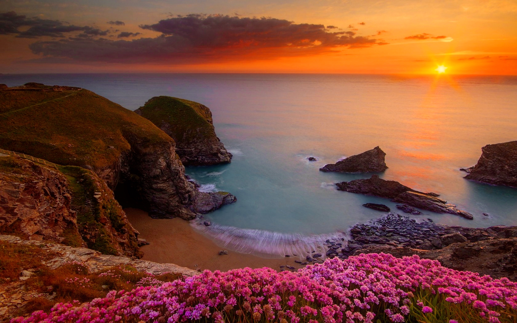 Description: A sunset over a rocky beach with pink flowers in the foreground and a body of water in the background.
