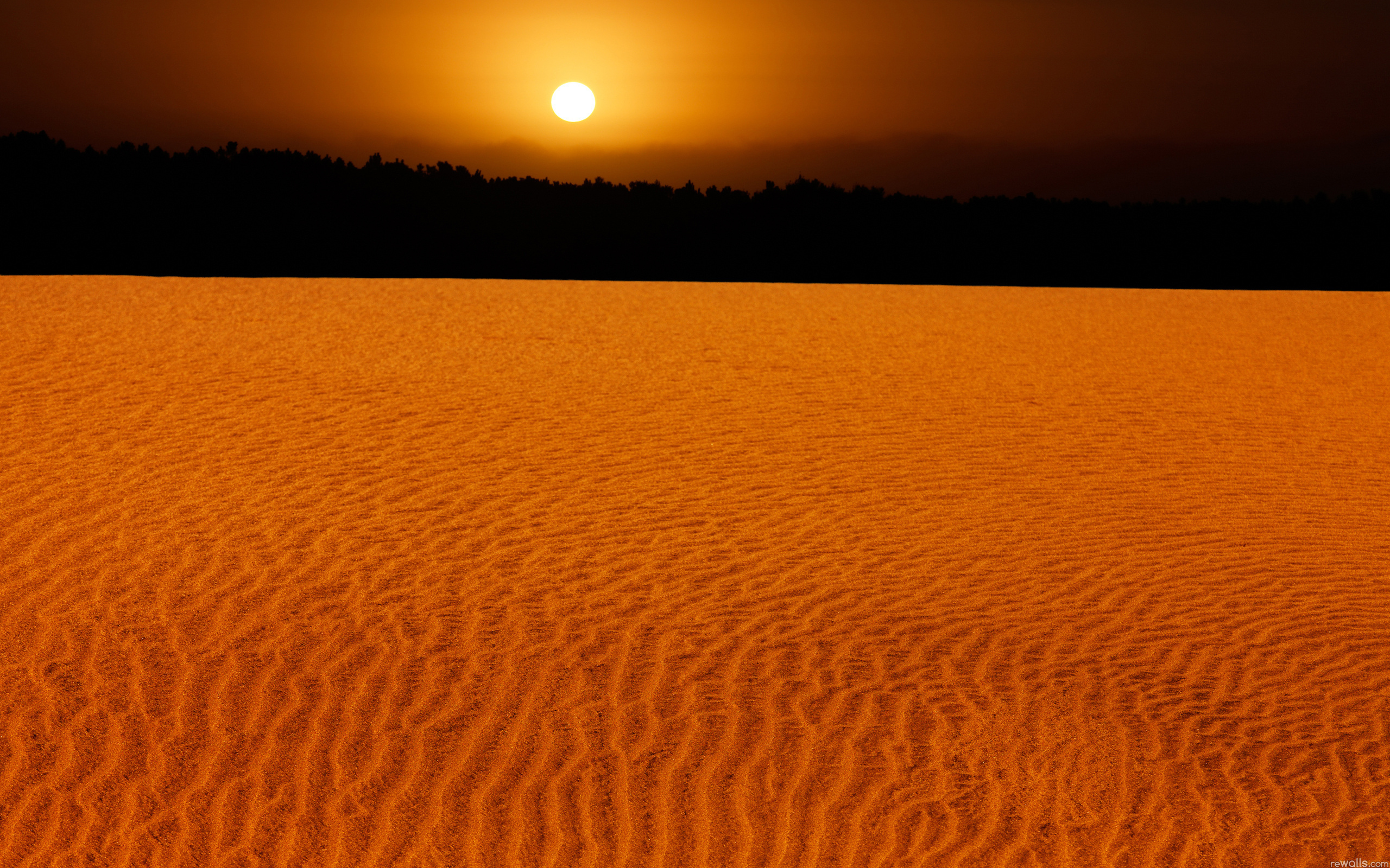 Description: A sunset over a sandy area with trees in the background and a bright orange sky above it.