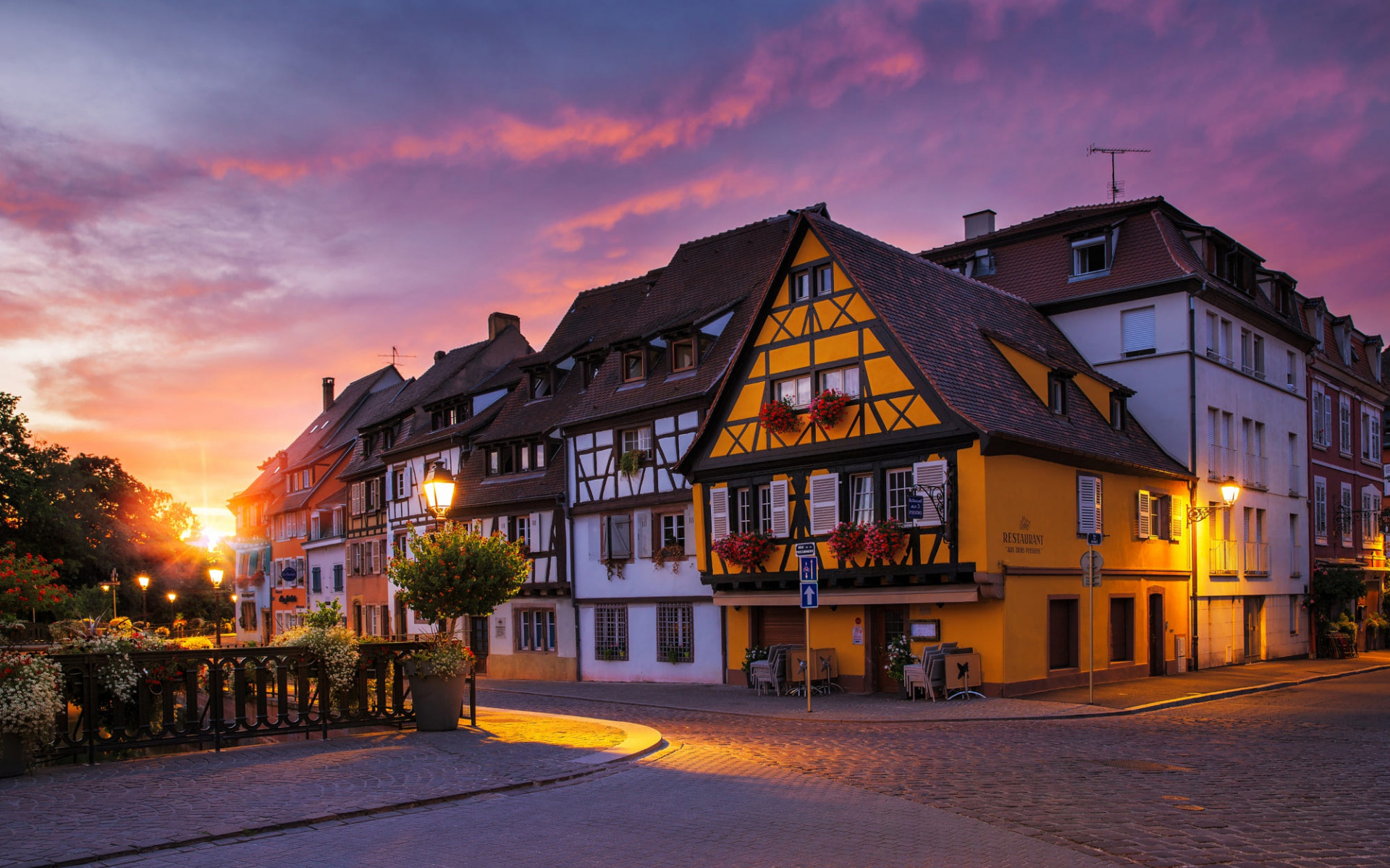 Description: A street with a building and a fence at sunset with a sky background and clouds in the sky and a few buildings with lights on.